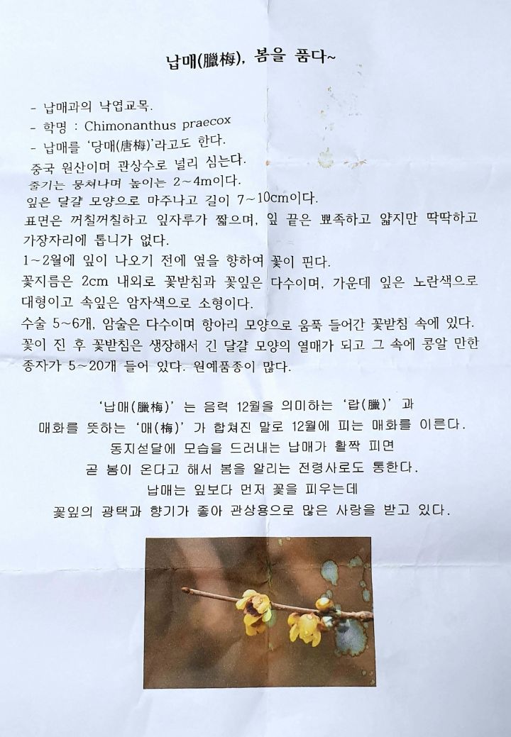 덕분에 안전하게 귀가했고 벌써 추억을 쌓았네요. (납매에 대한 자료와 몇 사진은 최경희회장 제공함ㆍ열정에 고맙습니다)