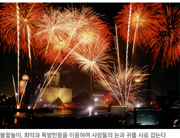 불꽃놀이도 화약과 폭발반응을 이용하여 사람들의 눈과 귀를 사로 잡는 놀이이다. 불꽃놀이용 화약에는 색을 나타낼 수 있는 물질, 알루미늄(Al)과 같은 금속 분말, 과염소산 칼륨(KClO4)이 포함되어 있다. 물질들이 순간적으로 반응하면서 가스 분출이 되면 충격파로 인해 요란한 소리와 함께 화려한 색상이 우리 눈을 어지럽히는 것이다. 공기에 포함된 산소만으로는 급격한 폭발을 유도하기 어려워 과염소산 칼륨과 과염소산 암모늄 (NH4ClO4)과 같은 산소를 공급할 수 있는 산화제를 첨가하는 것이다.