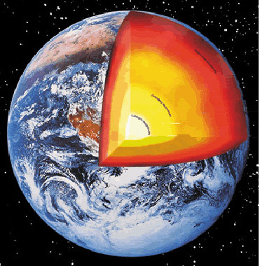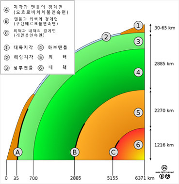 맨틀과 내핵 사이의 구간으로, 2,885km부터 5,155km 깊이에 해당하며, 두께는 2,270km이다. 온도는 깊어질수록 증가하는데 맨틀 부근에서는 4,400° 그리고 내핵 부근에서는 6,100°에 이른다. 외핵은 주로 철과 니켈 등으로 이루어져 있는데 산소나 황, 규소 같은 원소도 조금 섞여 있을 것으로 여겨진다. 외핵은 액체 상태로 존재하는데, 지구의 자전이나 방사성동위원소의 붕괴에 의한 열, 그리고 외핵에 녹아 있는 철 성분이 굳으면서 발생하는 열 등에 의해 외핵은 레미콘 차에 담긴 시멘트 반죽처럼 1초에 수 밀리미터씩 천천히 돌고 있다. 회전하는 외핵의 액체금속에 전류가 발생하면서 지구 자기장이 만들어 진다. 지구 자기장은 지구 전체를 에워싸는 큰 자기권으로 지구 바깥 수천 km까지 뻗어 있어 태양풍이나 우주방사선으로부터 지구를 보호하고 있다. |