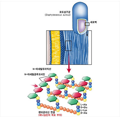 페니실린이 작용하는 부위는 미생물 세포의 세포벽이다. 세포벽이 유지되려면 펜타글리신 연결이 필요한데 페니실린은 펜타글리신 합성을 막는다. 세포벽에 구멍이 뚫린 세포는 삼투압으로 ‘터져’ 죽게 된다. | |