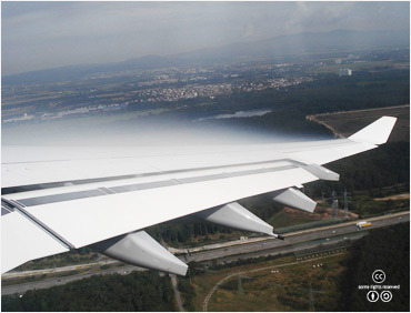 비행기 날개에서 일어나는 응결. 높은 고도에서는 기온과 기압이 낮아서 수증기의 응결이 쉽게 일어난다. <출처: (cc) Mgw89 at Wikipedia.org> |