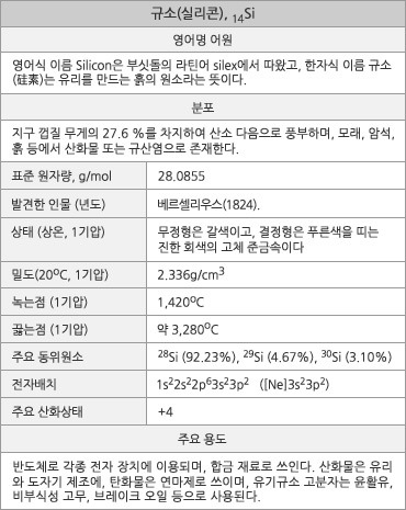규소의 표준원자량은 28.0855g/mol이다. 원자의 전자배치는 1s22s22p63s23p2 ([Ne]3s23p2)이며, 주된 산화수는 +4이나, 화합물에 따라서는 -4~+3 사이의 값을 갖기도 한다. 지각에서의 존재비는 약 27.6%로 산소 다음으로 풍부하다. 1기압에서 녹는점은 1,420oC이고, 끓는점은 약 3,280oC이다. 실온에서의 밀도는 2.336g/cm3이다. SiO2로의 연소열은 32.43J/g(7.75cal/g)이다. 녹음열과 증발열은 각각 50.6kJ/mol과 383kJ/mol이다. 전기 비저항은 약 1000Ω∙cm이고, 띠 간격 에너지는 106.7kJ/mol이다. 자연 상태에서는 안정한 동위원소 28Si(92.23%), 29Si(4.67%), 30Si(3.1%)로 있다. 첫 번째와 두 번째 이온화 에너지는 각각 786.3kJ/mol과 1576.5kJ/mol이다.