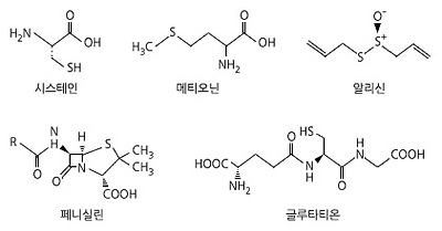 황을 포함하는 생물 분자들로는 아미노산인 메티오닌과 시스테인 이외에, 항생제 페니실린, 마늘의 활성 성분인 알리신(allicin), 비타민 비오틴과 티아민(B1) 등 여러 가지가 있다. 황은 또한 글루타티온과 같은 생물학적 항산화제나 여러 효소의 중요한 구성 원소이기도 하다. | |