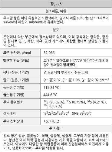 황(黃)은 유황(硫黃)이라고도 부른다. 황은 선사시대부터 알려져 왔고, 자주 사용된 비금속이다. 구약성서에는 소돔과 고모라를 (유)황과 불로 파괴하였다는 전설을 적고 있으며(창세기 19, 24), 기원전 800년경에 호메로스(Homeros)가 쓴 [오디세이]에는 황을 훈증 소독에 사용하는 것을 언급한 내용이 있다. 고대 로마의 대 폴리니우스(Pliny the Elder)는 [자연사(Naturalis Historia)] 제 35권에서 황을 훈증 소독, 의약품, 천의 표백에 사용하는 것을 언급하였다. 한의학에서는 고대부터 황을 여러 효능의 약제로 사용하였으며, 11세기 중국에서 발명되어 근대 화약이 나오기 전까지 사용되었된 흑색화약의 한 성분으로도 황이 사용되었다. 황이 불타는 것은 지옥의 상징이 되기도 했다. 화석연료에 들어 있는 황은 스모그와 산성비의 원인이 되는 아황산가스의 원천이기도 하나, 현재 사용하는 황은 대부분 화석연료에서 얻는다. 썩은 달걀, 시궁창, 스컹크의 냄새는 모두 황 화합물에서 나는 것이다. 반면에, 황산을 비롯한 많은 황 화합물들이 현대 산업에서 여러 용도로 아주 유용하게 사용되며, 여러 생물 분자들도 황을 구성 원소로 갖고 있다. 황과 황 화합물들에 대해 좀 더 자세히 알아보자.