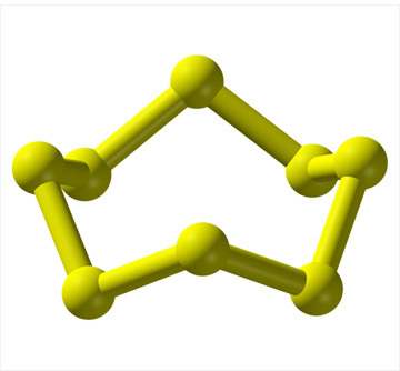 S8 이외의 황 동소체들도 많이 알려져 있다. S2 와 S3는 높은 온도에서도 안정한 기체이며, 각각 보라색과 붉은색을 띤다. 6개 이상의 원자로 된 동소체들은 실온에서 고체인데, S6는 주황색 고체이고 나머지는 노란색 고체이다. S∞를 제외하고는 모두 고리형 분자로 이루어져 있다. | |