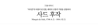 물론 그렇다고 해서 사드가 헛소문의 일방적인 피해자였다는 뜻은 아니다. 대중의 상상력 때문에 모함을 받긴 했지만, 평생의 행적을 돌아보면 인간 사드는 단단히 비뚤어진 사람이기도 했다. 20세기에 들어와서 프랑스의 초현실주의자를 중심으로 사드에 대한 재평가가 이루어지면서, 인습 타파를 이유로 그를 ‘진정한 자유인’으로 여기는 것이 대세가 되었는데, 그건 사실 본말이 전도된 평가에 불과하다. 왜냐하면 사드의 인습 타파는 그 자체가 목적이 아니라, 쾌락 극대화를 위한 수단에 불과하기 때문이다.