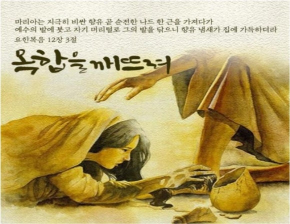 마리아의 행동은 죽은 나사로를 살려주신 예수님께 감사의 표시이며 아낌없는 헌신이며 겸손이며 사랑입니다.
