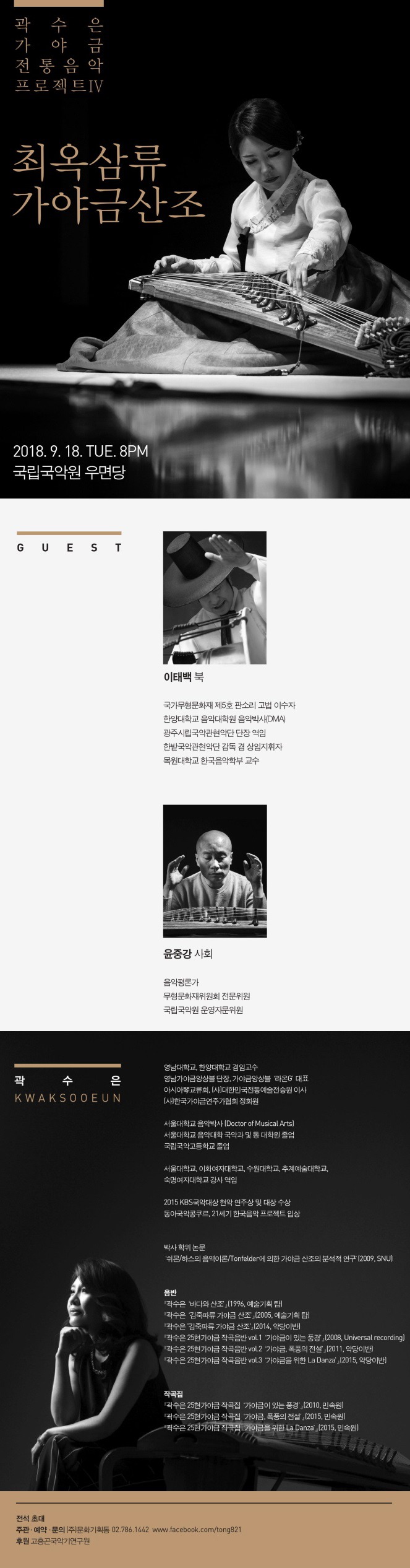 탄탄한 연주 실력을 갖춘 가야금 연주자이자 창작 작업으로 가야금 음악의 기능성을 실험하고 있는 작곡가이자 중견 연주자인 곽수은이 전통음악 프로젝트 네번째 무대에 오른다.