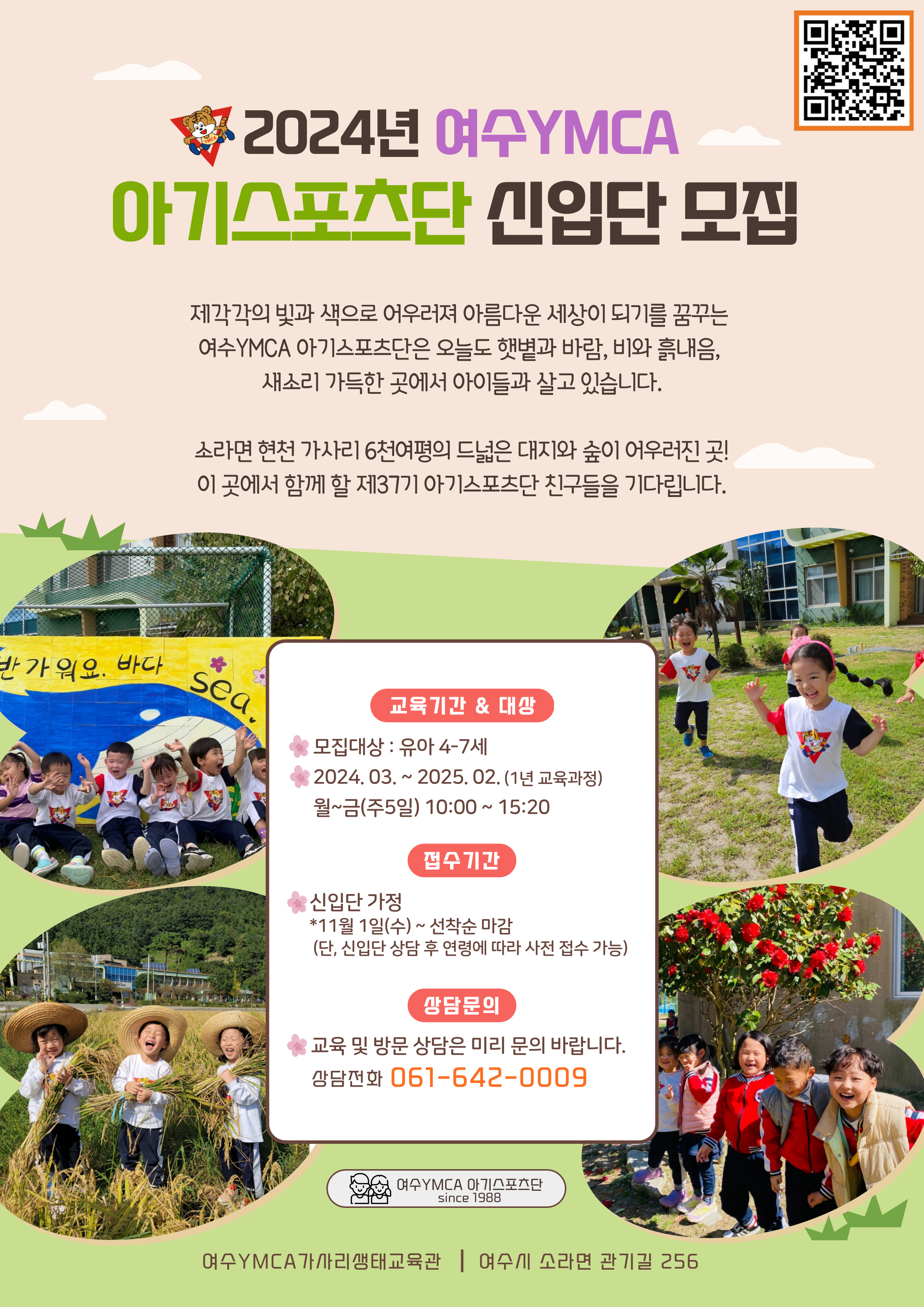 | 벌써 37살이 되어가는 여수YMCA아기스포츠단이 2024년 제37기 신입단 친구를 기다립니다. 36년간 아기스포츠단이 이어져 올 수 있었던 것은 진정으로 아이들을 생각하는 아기스포츠단 교육철학이 흔들림 없이 이어져 왔기 때문이라고 생각합니다. 아이들 편에서 웃고 떠들며 신명나게 행복할 수 있도록 내년에도 진정성 있는 교육을 담아내겠습니다. 어떤 장난감, 어떤 교구보다 더 풍요로운 삶의 지혜를 주는 자연이 친구가 되어주는 가사리생태교육관!! 아이다움이 가득한 이곳에서 행복한 아이들은 자연처럼 건강합니다. < 주위 유아(4~7세)가 있는 가정에 적극적인 홍보 부탁드립니다^^ > 사전 전화 및 방문 상담 신청 : ☎061)642-0009 10월 중순부터 방문상담 가능합니다.(방문 상담은 사전 신청 후 진행) |