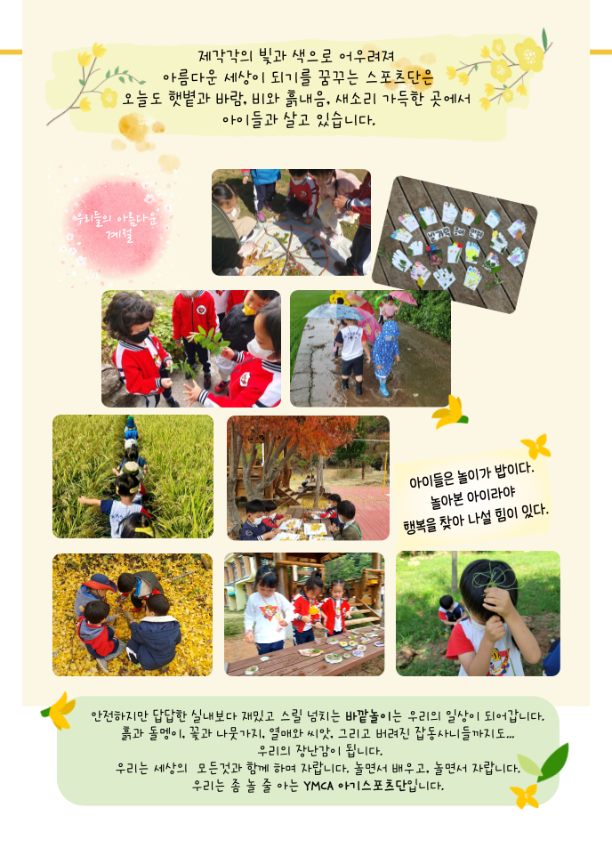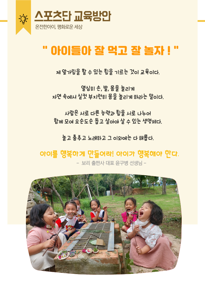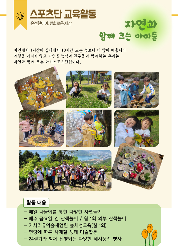 5천여평 자연과 숲이 어우러진 드넓은 교육환경 속에서 부모님들의 마음으로 생명·평화의 가치 속에 편견없는 시선으로 아이들을 바라보고