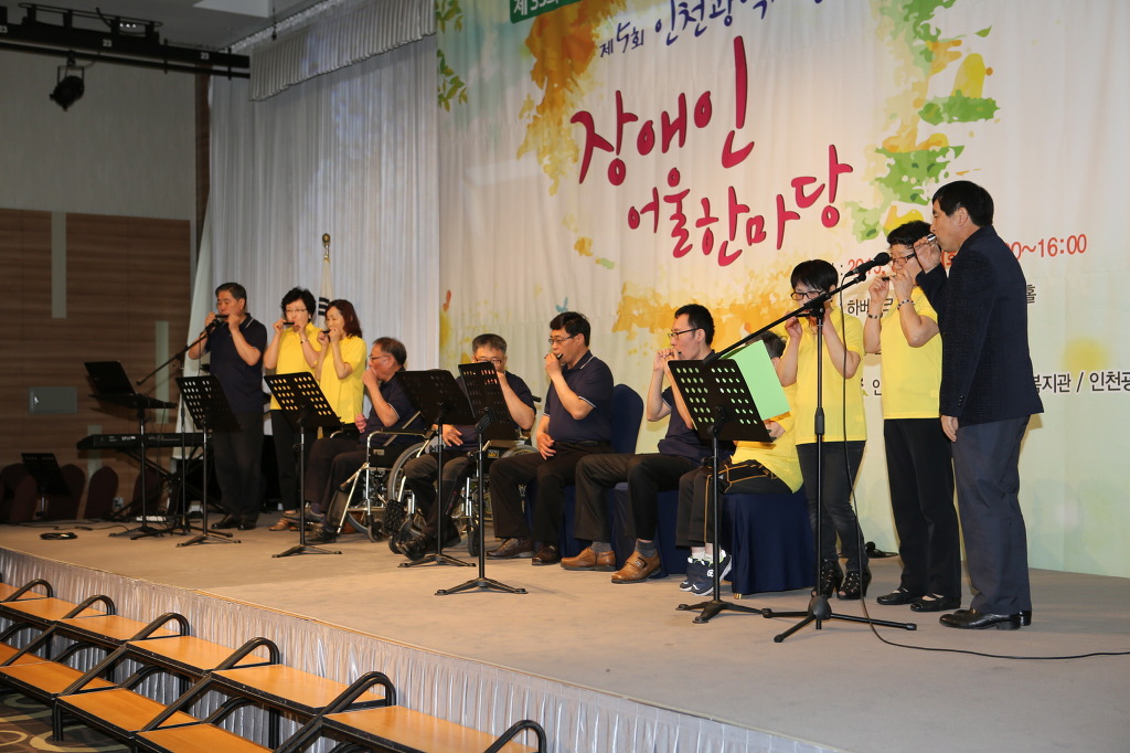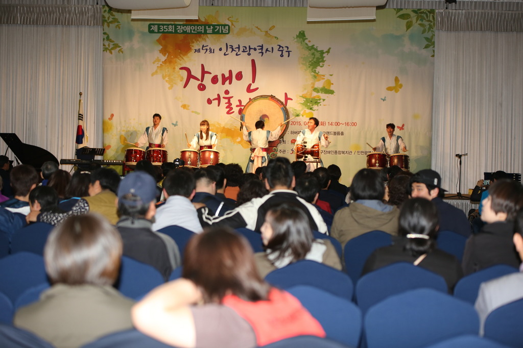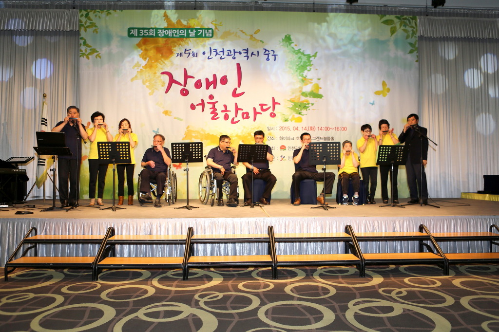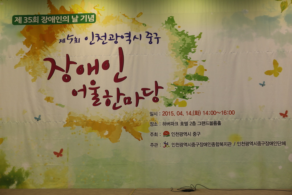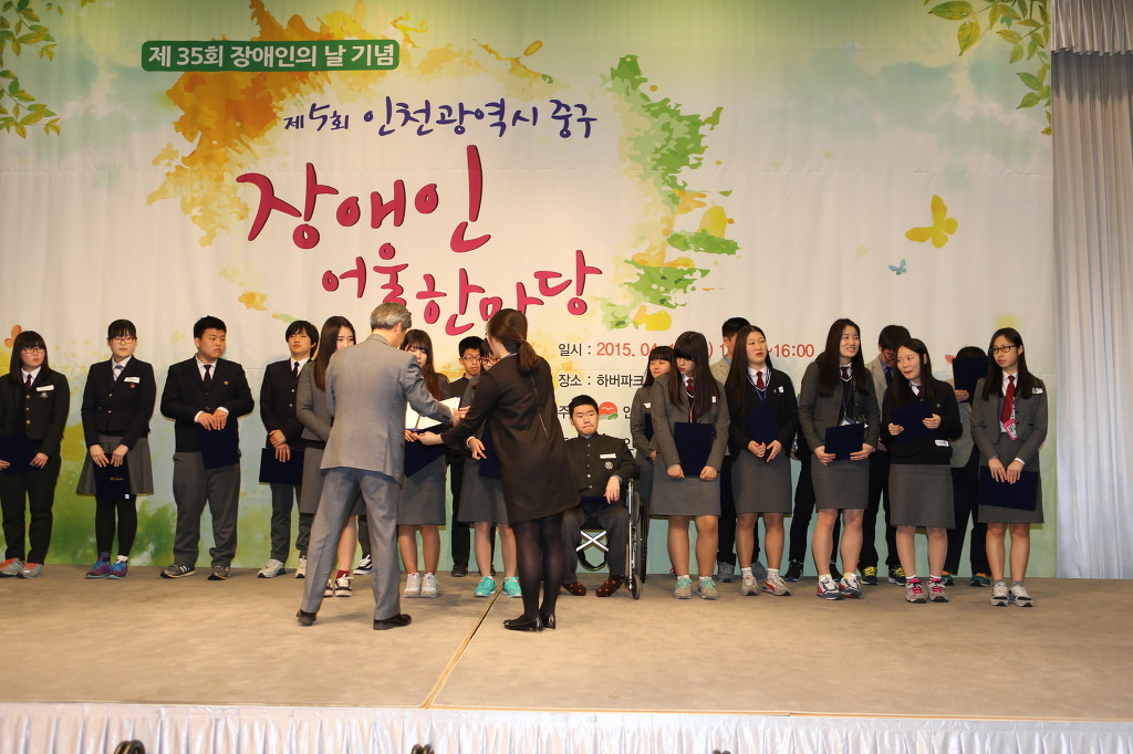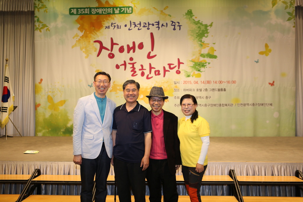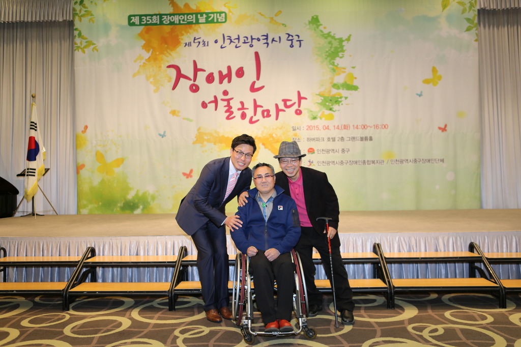 장애인의 날이란? 장애인의 날은 1981년 장애인 복지법을 지정 시행해오며 4월20일을 장애인의 날로 명시하였으며 장애인들의 재활과 자립 의욕을 북돋우고.장애인들에 대한 국민의 관심을 높이기 위해 재정되었습니다 4월20일을 장애인의 날 로 정한것은 4월이 1년 중 모든만물이 소생하는 계절이어서 장애인 의지를 부각시킬 수 있다는 데 의미를 둔 것이며 20일은 다수의 기념일과 중복을 피하기 위해서입니다 제5회를 맞이하는 인천 중구 장애인 복지회관 (정용충관장) 에서 중구 하버파크호텔 2층 그랜드볼륨홀 에서 중구청장님 외 여러 귀빈을 모신자리에서 모범장애인및 장애인복지 기여자 포함 중구청장. 협의회장 사회복지협의회장 표창장 및 재)국제 평생교육 개발원 저소득가정 장애인 청소년 20명 장학금전달 및 제5회 인천광역시 중구 장애인 어울림 한마당 이 열렸습니다 전통연희단 잔치마당.해오름 하모니카.1급장애인 마술.노래 박순예. 시각장애인 섹소폰여주 등 다양한 장애인 어울림 이 있었습니다 사회:중구자애인 사회복지회관 홍보대사 탤런트 박성균 2015년4월14일(화) 14:00~16:00