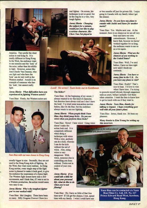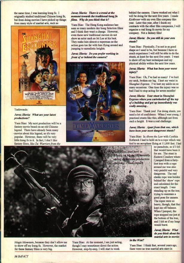 쿵후 영화 슈퍼스타인 성룡, 홍금보와 함께 원표는 경극 학교를 졸업하고 동문들과 함께 <쾌찬차>, <하일복성>, <비룡맹장> 등과 같이 흥행에 성공한 영화에 출연하였다. 홍금보는 자신이 제작한 <동방독응>, <부귀열차>와 같은 영화에 좋은 영향을 주기 위해 자신의 사제를 주연으로 기용했던 반면, 원표는 현재 홍콩에 Visual Impact라는 회사를 설립하여 스스로 운영하고 있다. 그럼에도, 우리가 알고 있는 한 원표는 영어로 인터뷰를 한 적이 한 번도 없다. 우리 Impact 잡지의 Jawaz Illaavia 기자와 그의 믿음직한 통역가 Donia Chong은 처음으로 원표와 인터뷰를 하는데 매우 기쁘게 생각한다.