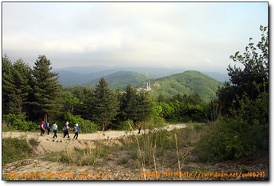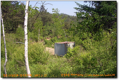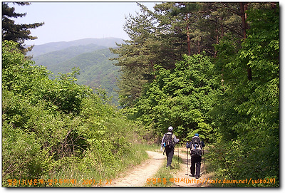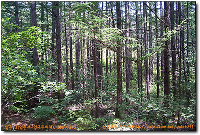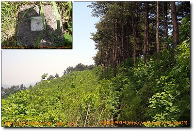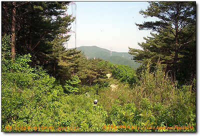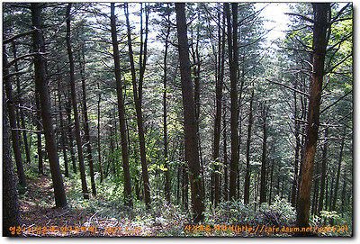 방사곡고개에서 좌측산길로 들어서 울창한 낙엽송밭을 지나 쭉쭉뻗은 적송들뒤에서