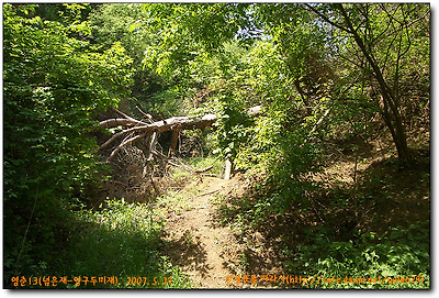산사면을 따라 2-3분나가다보니 길은 작은 계곡을 건너고 계곡엔 큰 나무도 넘어져있는듯하여