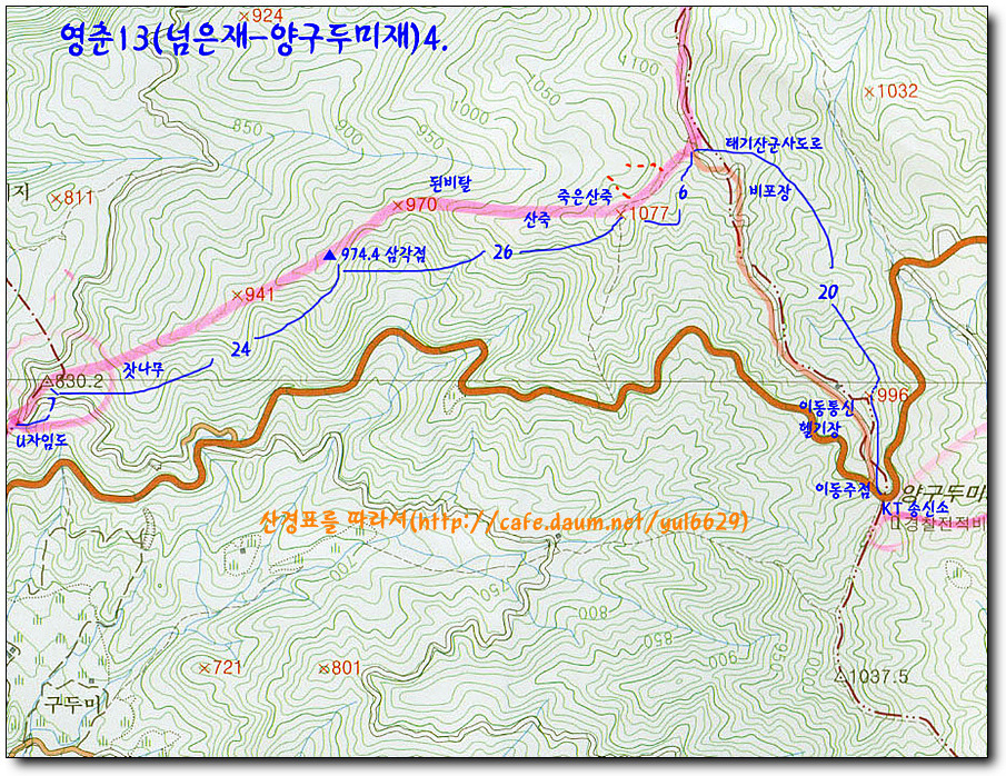 25000지도에도 없는 삼각점이 x941봉과 x970봉사이에 있고 양구두미재로 오르는 도로가 보이고