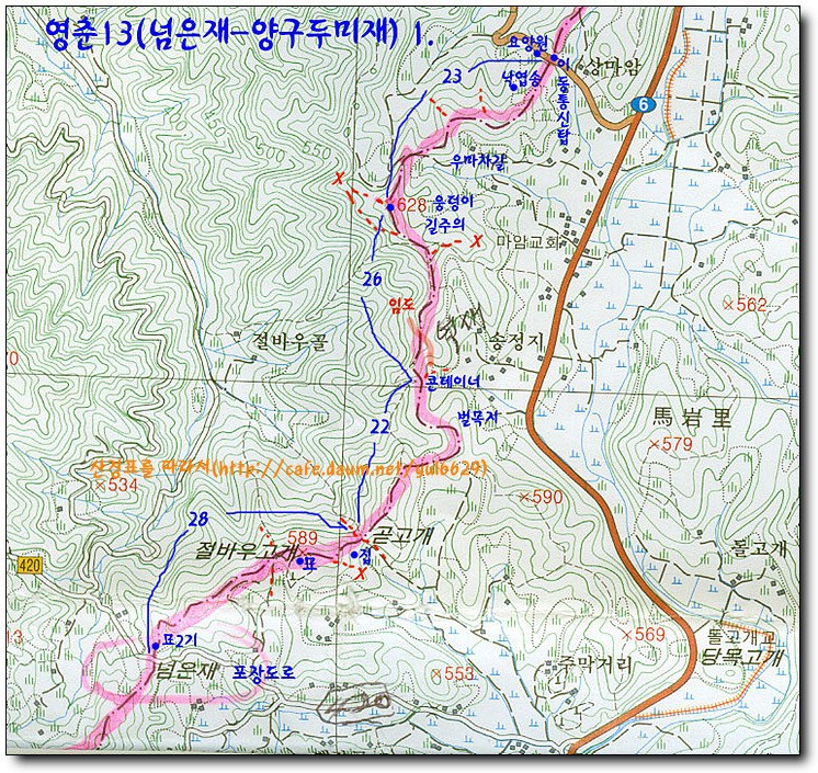 5만 지도는 넘은재 전에 삼거리가 있고, 25000지도는 고개넘어 좀 가서 삼거리가 있고,