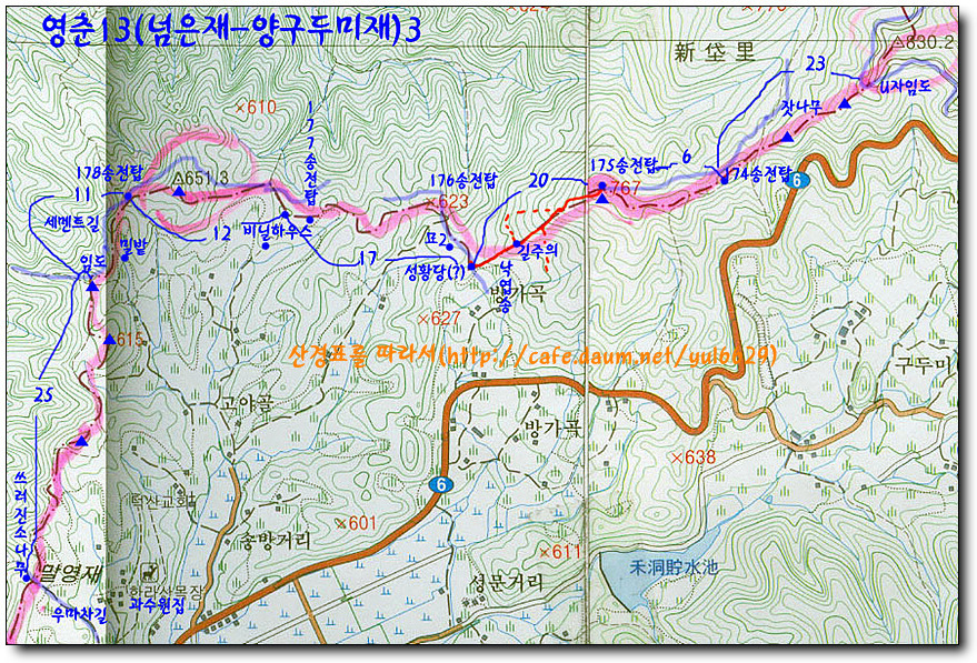 178번 송전탑-△651.3m-임도-안부(우측에 비닐 하우스와 농가)-177번송전탑-임도-176번 송전탑-방가곡 고개(성황당?)-