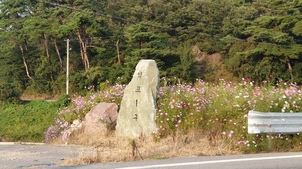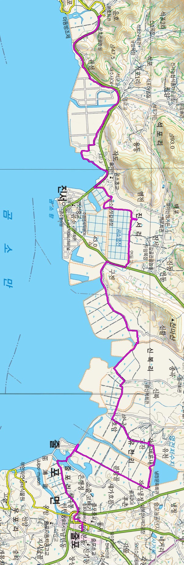 16:06~16:19 도로 옆 작은 숲으로 들어 구진마을에서 범섬을 거쳐 곰소(옛 웅연도)를 돌아 나오는
