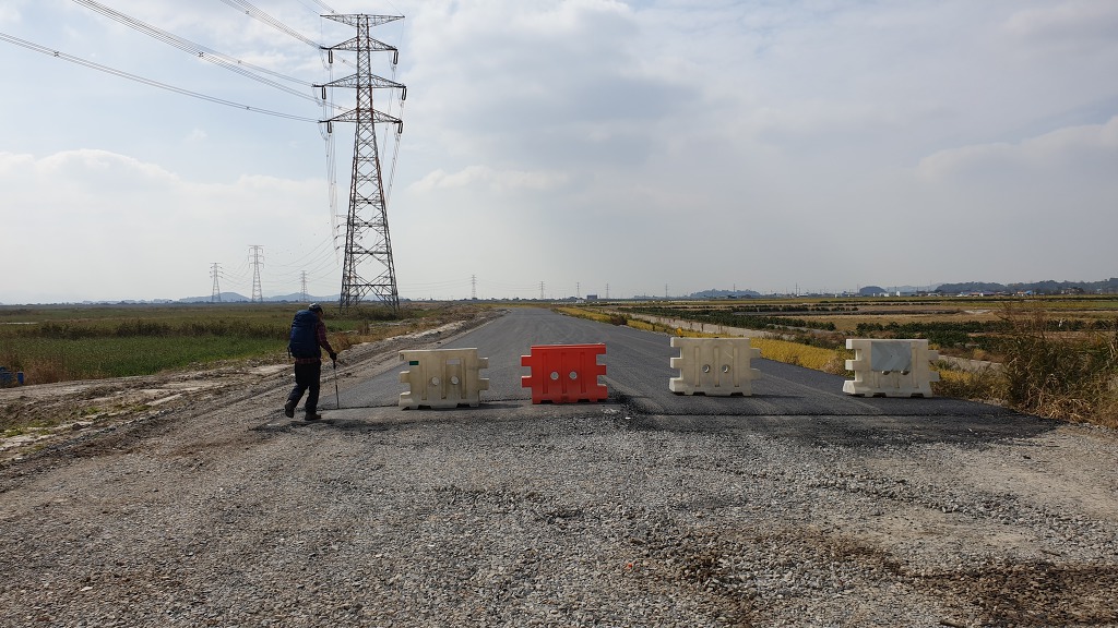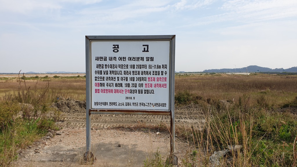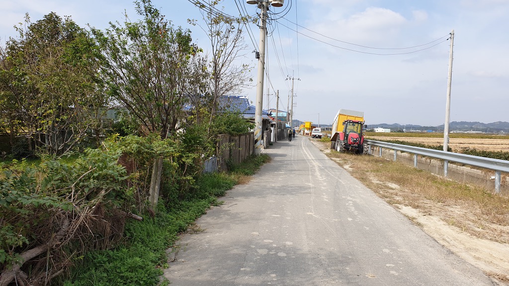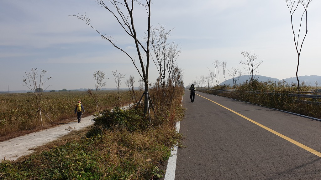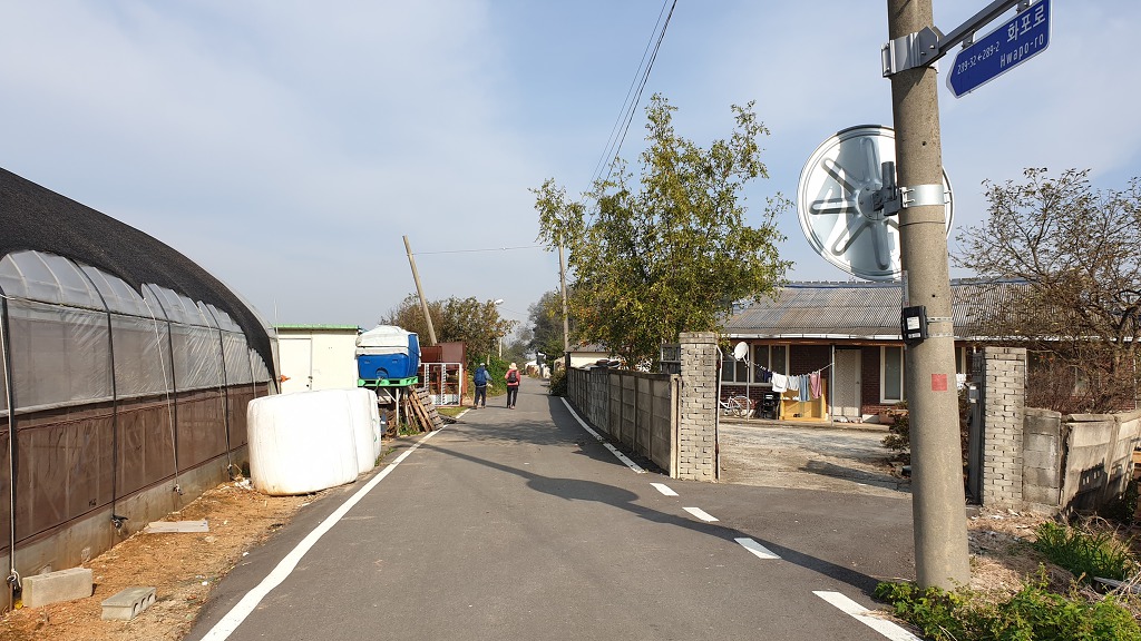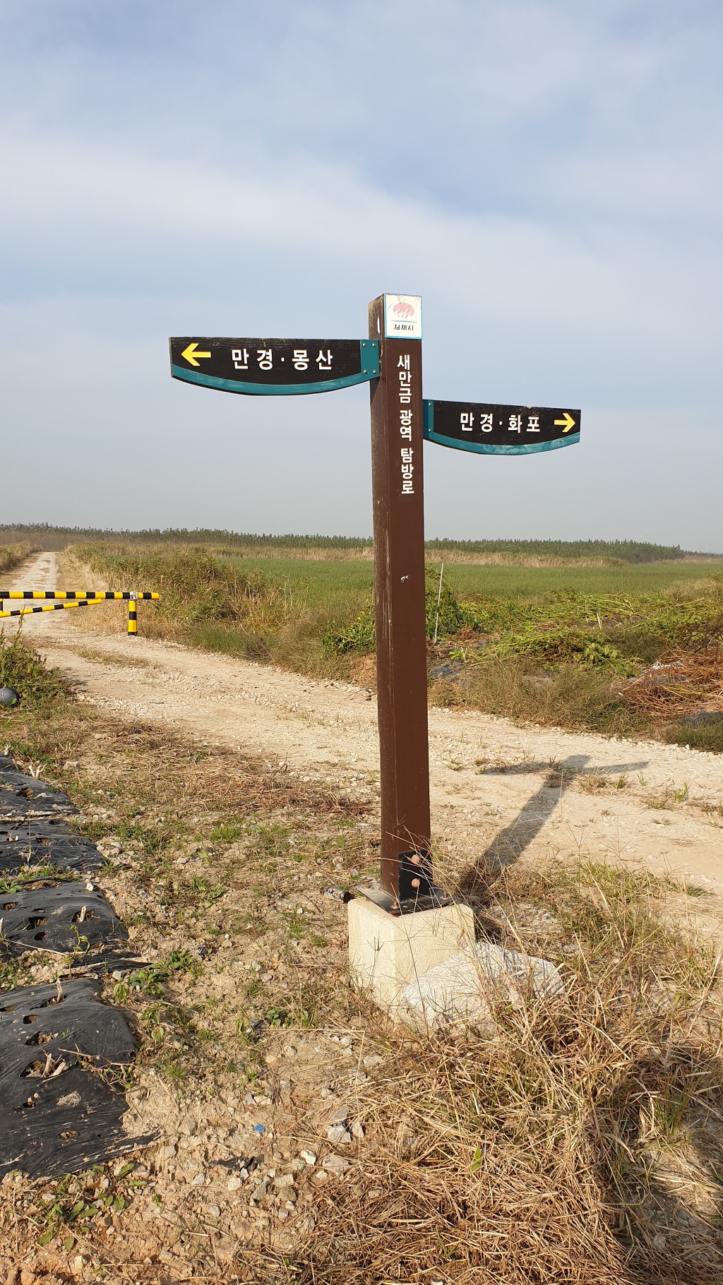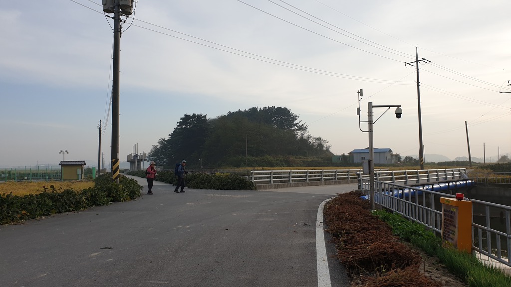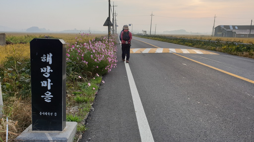 09:05 새만금 광역탐방로 표지목-오른쪽에서 오는 2차로 따라 화포마을 바라보며.