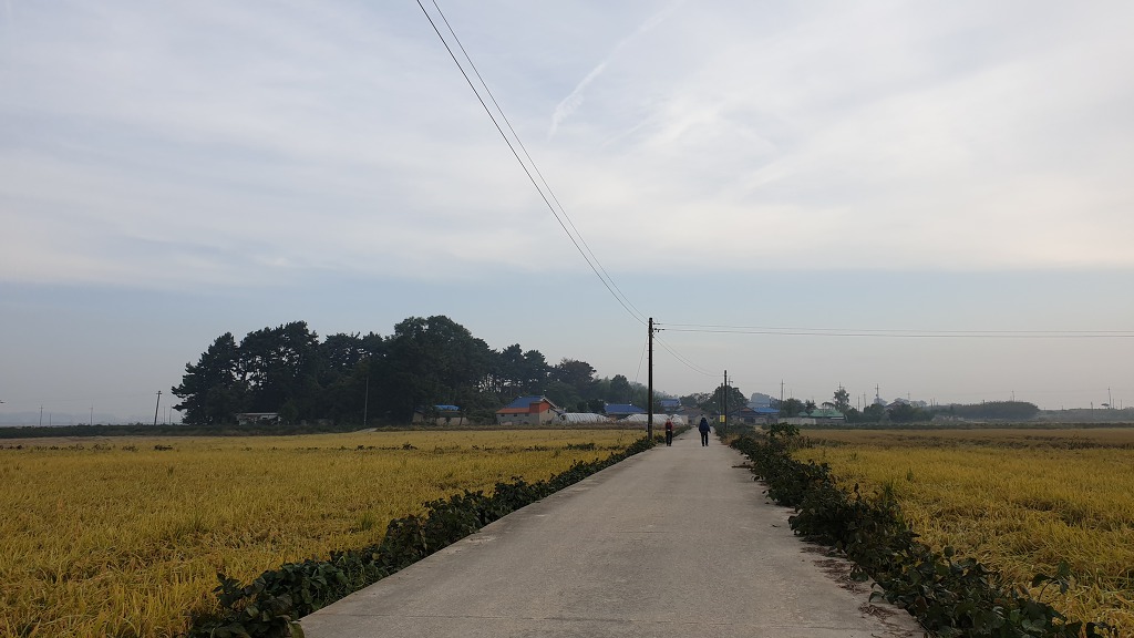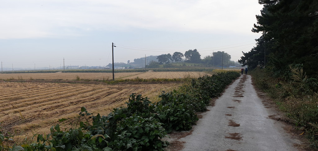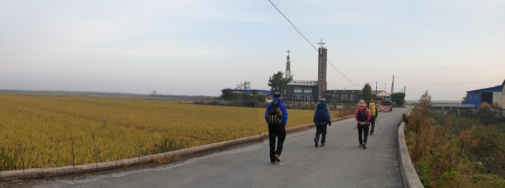 07:08 고사교회 앞에서 오른쪽으로 꺾어 관기마을을 지나 해망마을 가는 직선 도로를 따라간다.