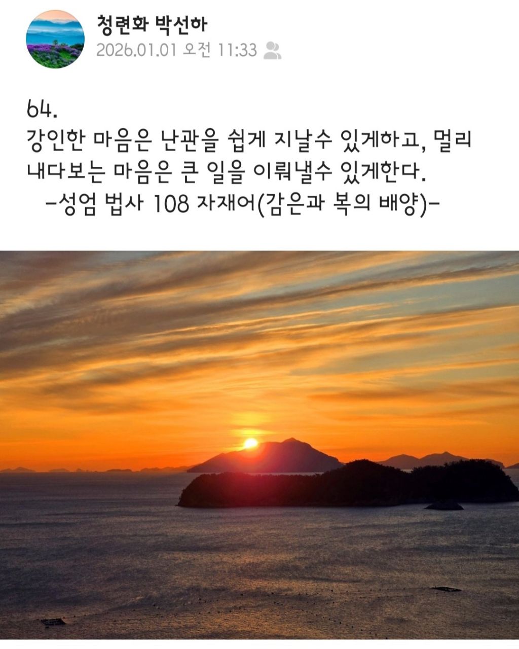 성엄법사 108자재어 작성자선근회향요익중생|작성시간26.01.02|조회수34 목록 댓글 7 글자크기 작게가 글자크기 크게가 다음검색 현재 게시글 추가 기능 열기 북마크 공유하기 신고 센터로 신고 댓글 댓글 7 댓글쓰기 댓글 리스트 작성자마니주 | 작성시간 26.01.02 _()()()_ 작성자무량화* | 작성시간 26.01.02 _()()()_ 작성자청산(靑山) | 작성시간 26.01.02 _()()()_ 작성자眞如華 | 작성시간 26.01.03 _()()()_ 작성자보리월 | 작성시간 26.01.03 _()()()_ 댓글 전체보기