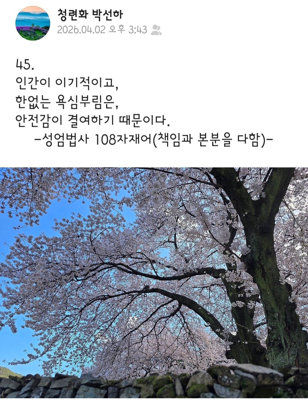 성엄법사 108자재어 작성자선근회향요익중생|작성시간26.04.03|조회수20 목록 댓글 5 글자크기 작게가 글자크기 크게가 다음검색 현재 게시글 추가 기능 열기 북마크 공유하기 신고 센터로 신고 댓글 댓글 5 댓글쓰기 댓글 리스트 작성자대등행 | 작성시간 26.04.03 new _()()()_ 작성자마니주 | 작성시간 26.04.03 new _()()()_ 작성자自明華 | 작성시간 26.04.03 new _()()()_ 작성자청산(靑山) | 작성시간 26.04.03 new _()()()_ 작성자眞如華 | 작성시간 01:10 new _()()()_ 댓글 전체보기