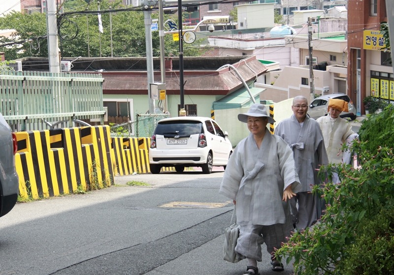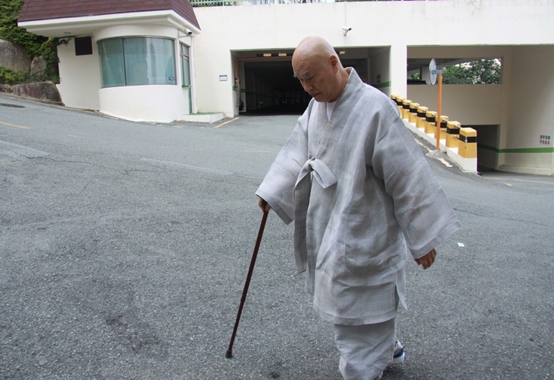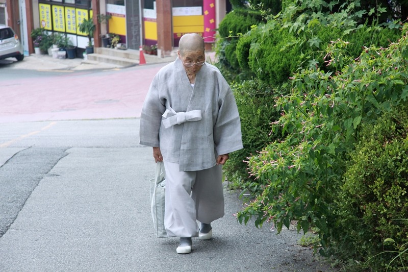 대웅전에서 화엄전 올라가는 길, 푸른 대나무들은 더위속에서도 창창하다. 대나무들이 겨울에 더 멋질 줄 알았더니 뜨거운 여름에도 멋지다. 카메라를 꺼내 사진을 찍는데 고운 언덕길에 가사를 입고 내려오는 스님이 계신다.