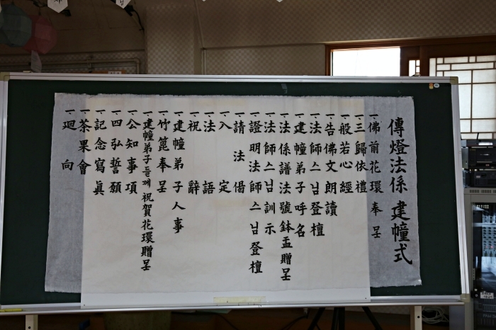 법호를 줄 때는 법사가 제자의 법호에 대해서 해석을 하며, 법통계승의 내용을 기록한 족패(族牌)를 준다. 이 족패에는 석가모니로부터 몇 대째로 법통을 이어받은 몇 대째 법손임이 기록되어 있다. 이 의식 때 제자는 반드시 최초의 설법을 하여 여러 승려들 앞에서 스스로의 경지를 보여주게 되는데, 이것은 잘못된 건당이 아님을 객관적으로 증명하게 하는 것이다. 이 의식은 신라 말부터 선종과 교종이 모두 행하여서 현재에도 그대로 전승되고 있다.