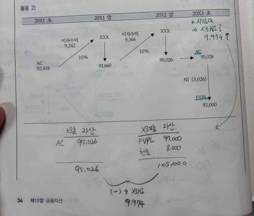 중급회계 [4판-下] 제 12장 금융자산(p.34) 작성자전우진|작성시간26.03.06|조회수41 목록 댓글 1 글자크기 작게가 글자크기 크게가 기초자산과 기말자산 차이로 당기손익을 구하는 방식에 대한 질문입니다. x3년초 자산에 ‘AC금융자산 + x1,x2년에 들어온 액면이자 현금16,000원‘ 이 되어야 하는 것이 아닌지 여쭙고자 글 남깁니다. 다음검색 현재 게시글 추가 기능 열기 북마크 공유하기 신고 센터로 신고 댓글 댓글 1 댓글쓰기 답글쓰기 댓글 리스트 작성자황윤하 | 작성시간 26.03.08 현금 16,000원은 기초 기말 동일하게 있습니다. 기초와 기말에 동일하게 포함하든 안하든 당기손익은 동일합니다. 댓글 전체보기