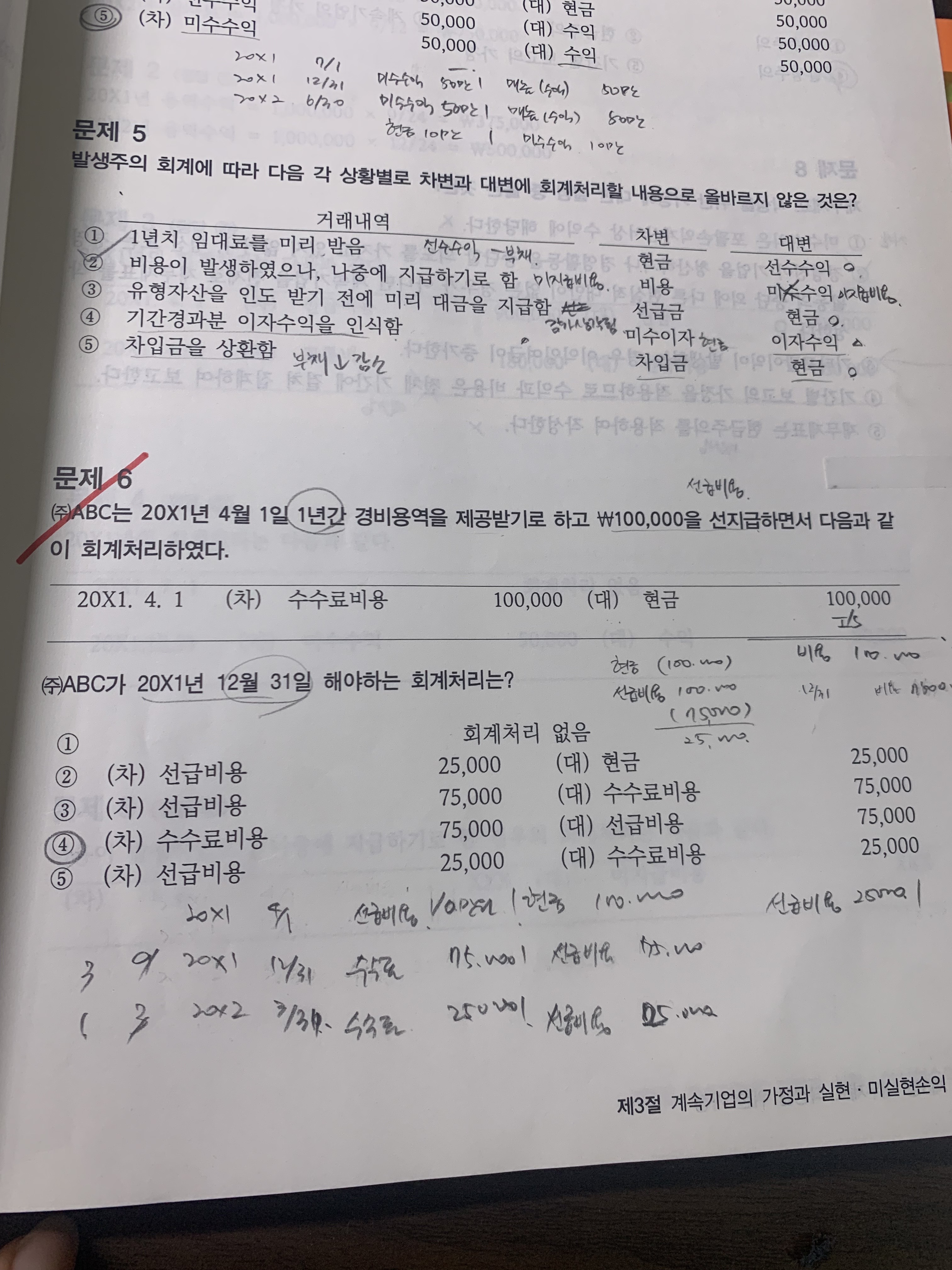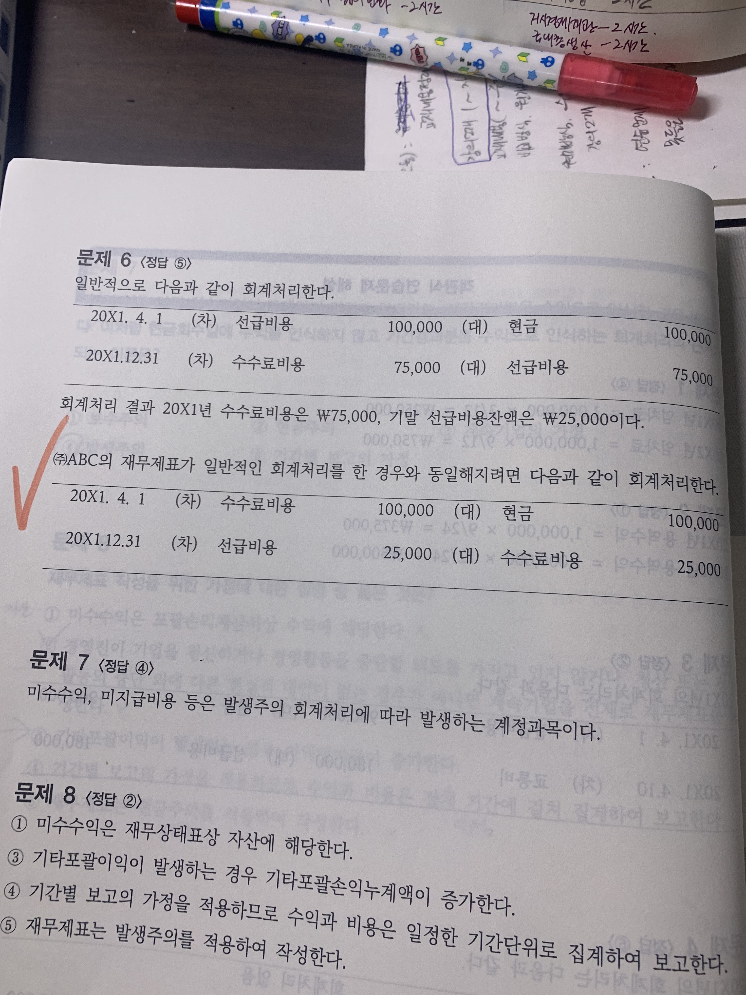 ㅎㅇㅍㅅ 감평사 회계원리 교재 63p 객관식문제 6번 작성자김은혜|작성시간21.09.01|조회수205 목록 댓글 1 글자크기 작게가 글자크기 크게가 어째서 답이 4번이아니라 5번이 나오는지 해설을봐도 잘 이해가 안갑니다 ㅠㅠ 설명부탁드려요 다음검색 현재 게시글 추가 기능 열기 북마크 공유하기 신고 센터로 신고 댓글 댓글 1 댓글쓰기 답글쓰기 댓글 리스트 작성자황윤하 | 작성시간 21.09.01 문제에서 처음에 선급비용 10만 / 현금 10만이 아니라수수료비용 10만 / 현금 10만 이라고 분개했다고 가정했습니다.만약 처음에 선급비용 10만/현금 10만으로 분개했다고 가정하면 5번이 정답입니다. 그러나 문제에서 다른 회계처리를 했다고 가정했습니다. 출제자의 가정을 확인해 주시기 바랍니다. 댓글 전체보기