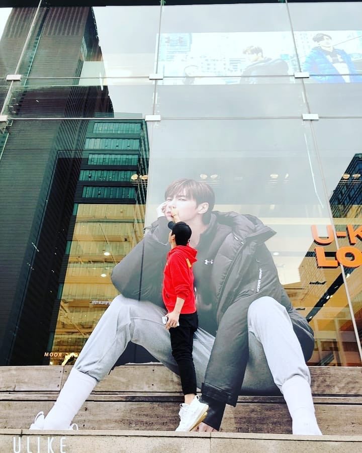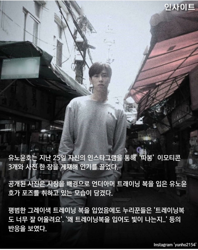 사진 속 유노윤호는 시장을 배경으로 포즈를 취한 모습이다. 편안한 트레이닝복 차림의