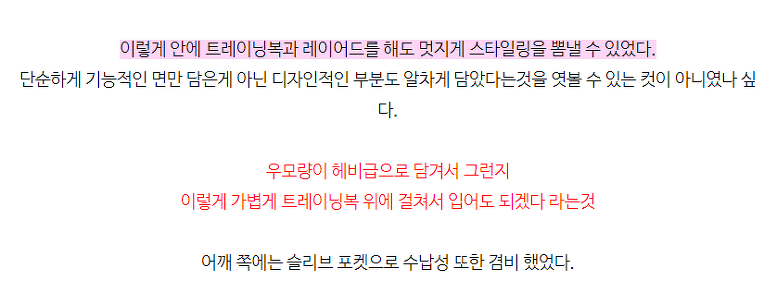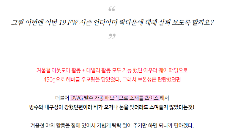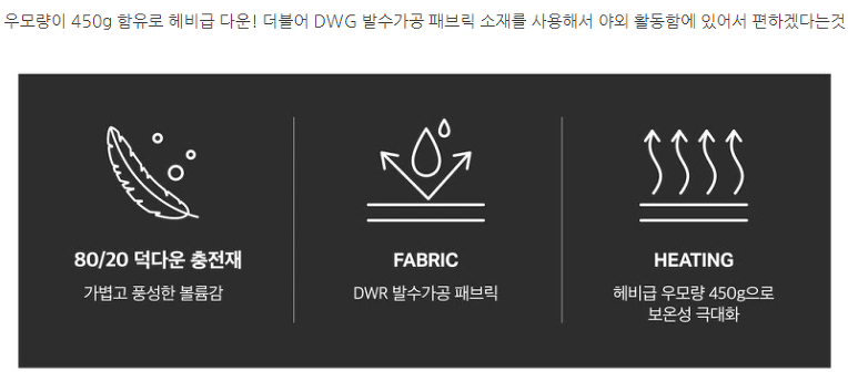 특히 겨울옷의 핵심인 ‘우모량’이 450g으로 혹한기에도 견딜 수 있는 헤비급 다운에 속하는데요.