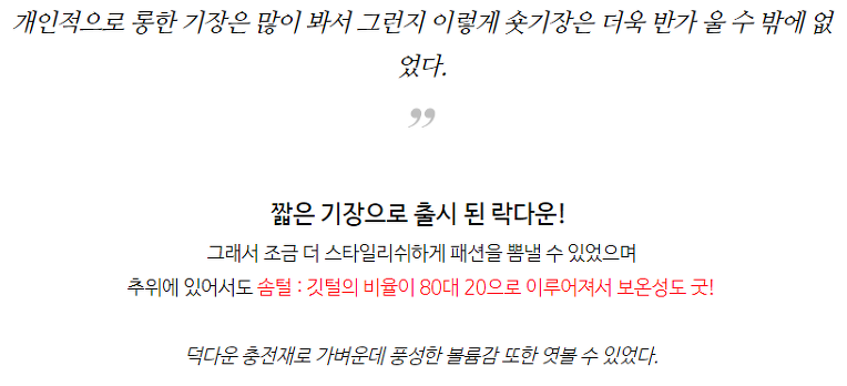 덕다운 충전재를 사용해 가볍고 풍성한 볼륨감을 자랑한다고 하죠