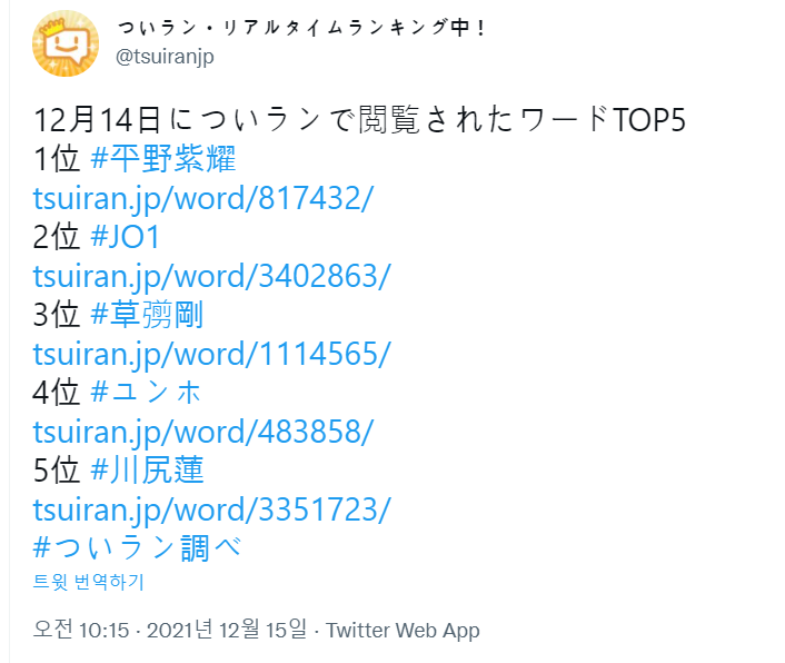 12月15日についランで閲覧されたワードTOP5
