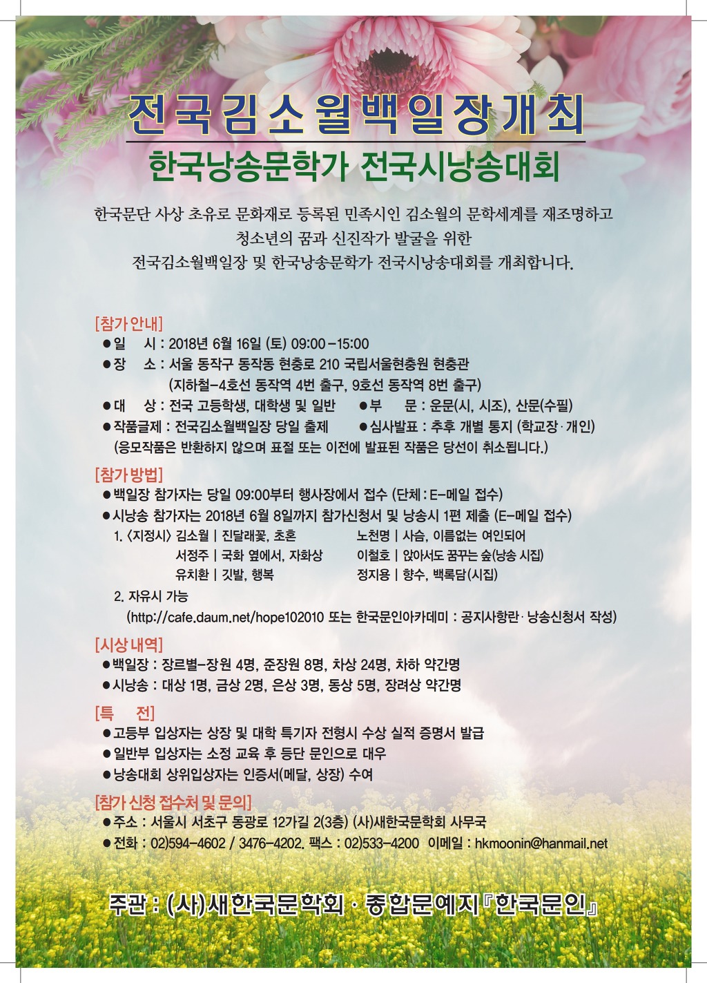 전국김소월 백일장 및 한국 낭송문학가 전국시낭송대회 작성자토담김종대|작성시간18.05.24|조회수9 목록 댓글 0 글자크기 작게가 글자크기 크게가 한국낭송문학가협회 전국시낭송대회 참가신청서.hwp 첨부파일첨부된 파일이 2개 있습니다. jpg 파일 2018 김소월백일장 포스터(인쇄용).pdf_page_1.jpg 다운로드 hwp 파일 한국낭송문학가협회 전국시낭송대회 참가신청서.hwp 다운로드 다음검색 현재 게시글 추가 기능 열기 북마크 공유하기 신고 센터로 신고 댓글 댓글 0 댓글쓰기 답글쓰기 댓글 리스트