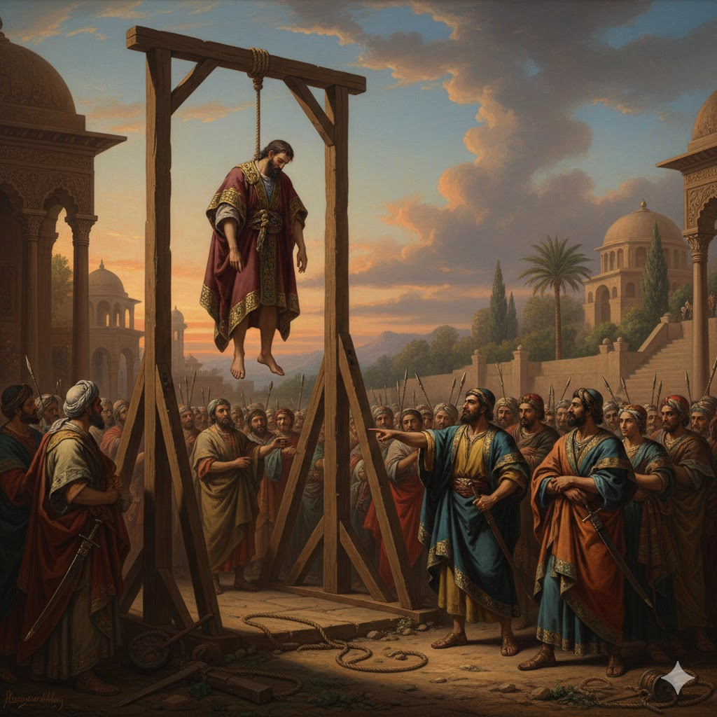 그래서 그들은 모르드개를 위해 준비했던 교수대 위에 하만을 매달았다.