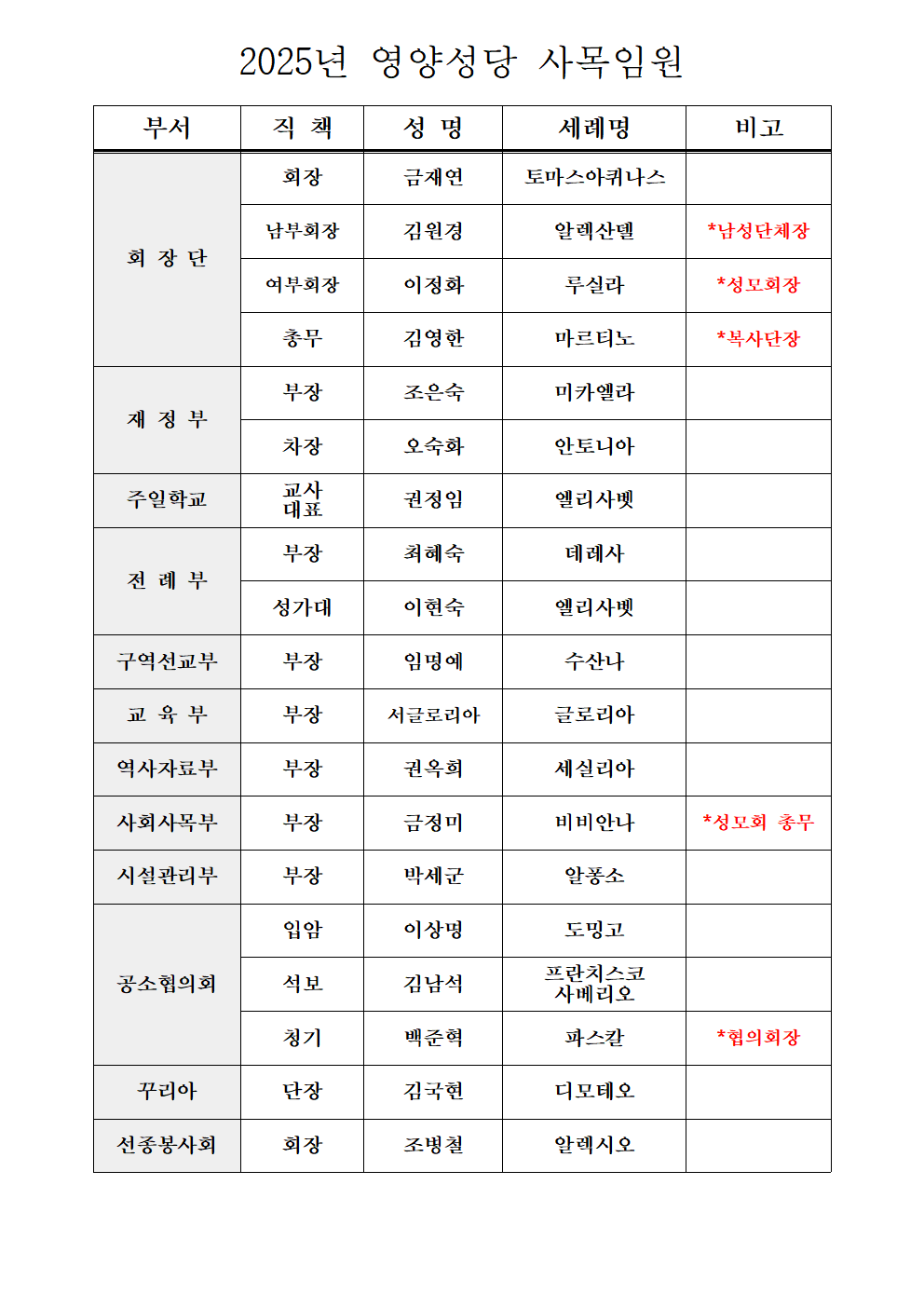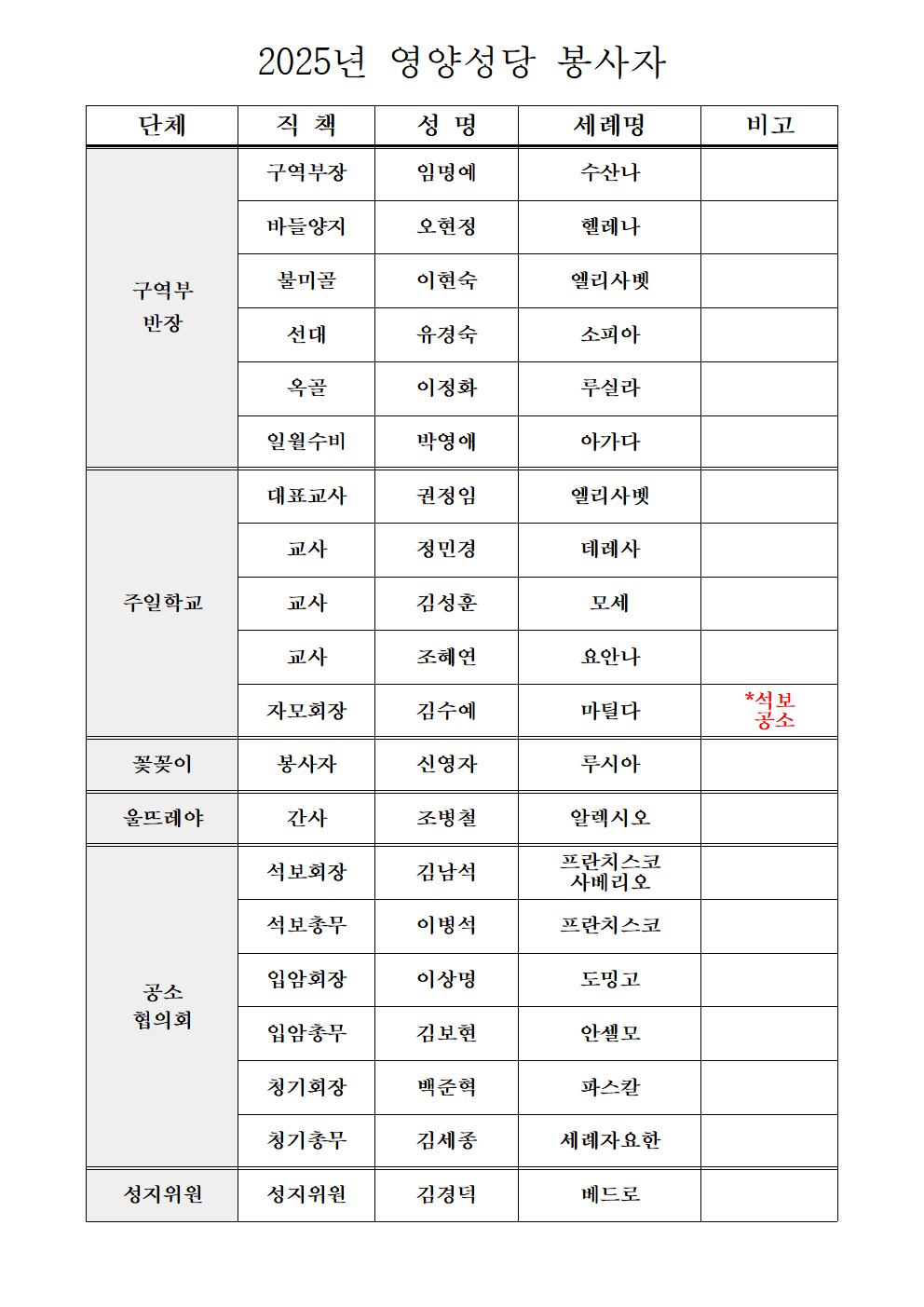 2025년도 영양성당 봉사자 작성자PIETROKIM|작성시간25.01.14|조회수110 목록 댓글 0 글자크기 작게가 글자크기 크게가 *머루산성지의 지속적인 관심과 진행사항의 연속성을 위하여석보공소의 김경덕 베드로 형제님을 성지위원으로 새롭게 임명합니다. 다음검색 현재 게시글 추가 기능 열기 북마크 신고 센터로 신고 댓글 댓글 0 댓글쓰기 답글쓰기 댓글 리스트
