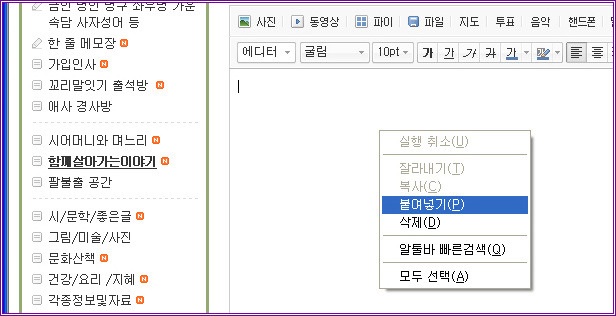 1편에서는 한글워드를 이용했는데 이번에는 <다음카페 글쓰기>게시판을 이용하여 보겠습니다.