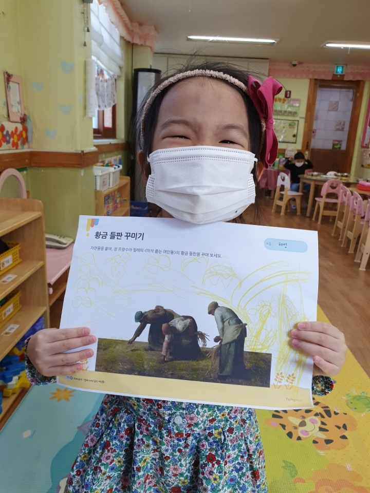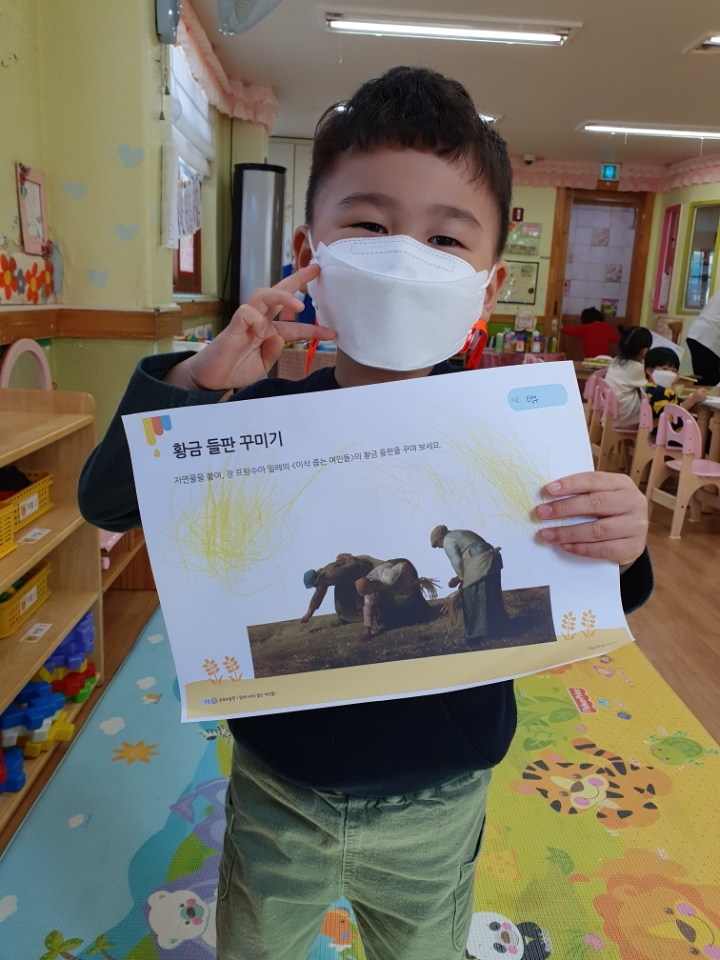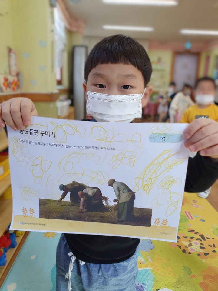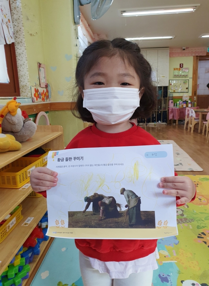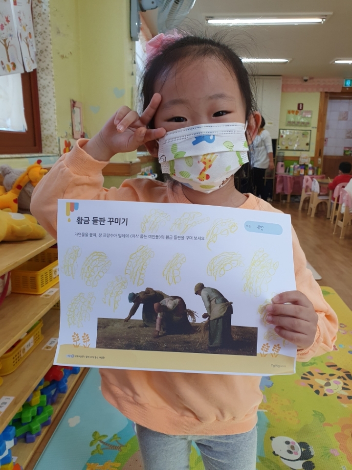 명화 - 장 프라수아 밀레 <이삭 줍는 여인들> 작성자연두반 교사|작성시간20.10.06|조회수1,015 목록 댓글 0 글자크기 작게가 글자크기 크게가 오늘은 이삭줍기에 대해 이야기 나누고 장 프랑수아 밀레의 <이삭 줍는 여인들> 작품을 감상해보았습니다.노랗게 익은 벼를 그려 명화를 창의적으로 재구성해 보기도 하였습니다🌾 다음검색 현재 게시글 추가 기능 열기 북마크 공유하기 신고 센터로 신고 댓글 댓글 0 댓글쓰기 답글쓰기 댓글 리스트