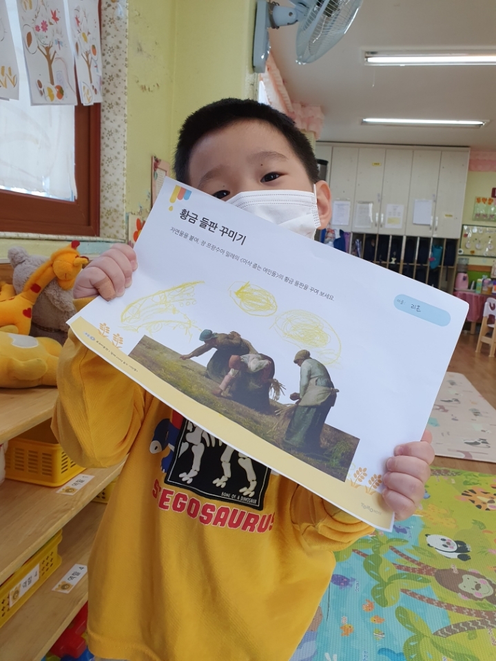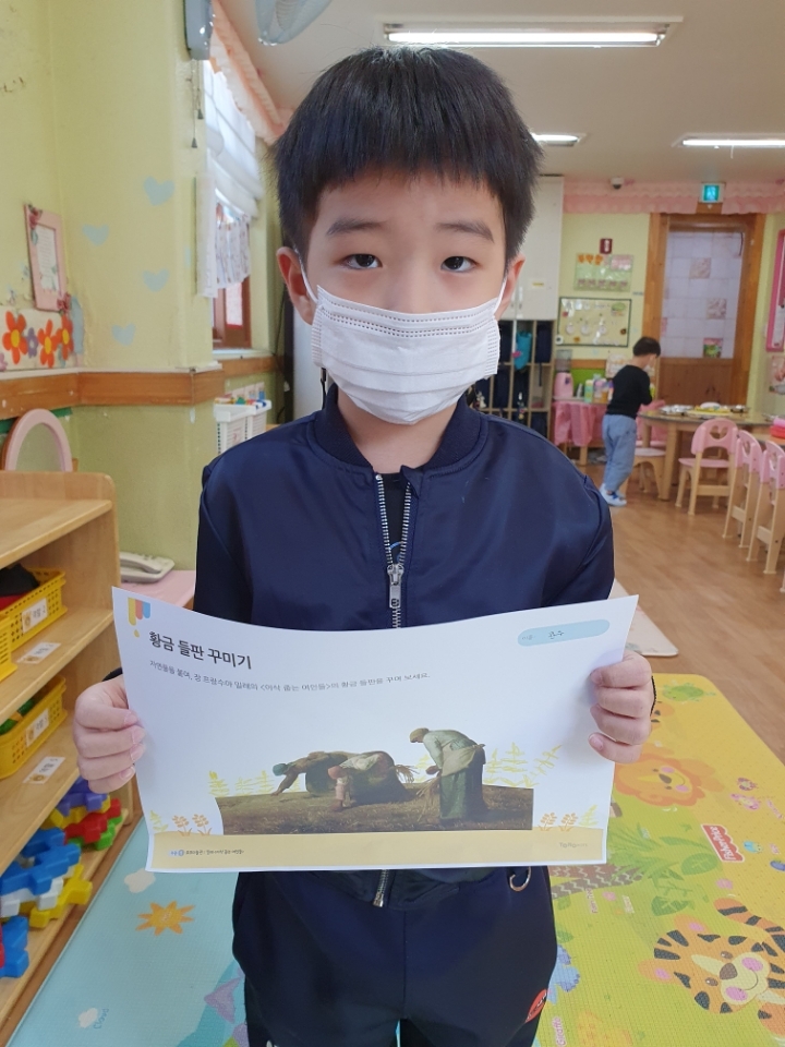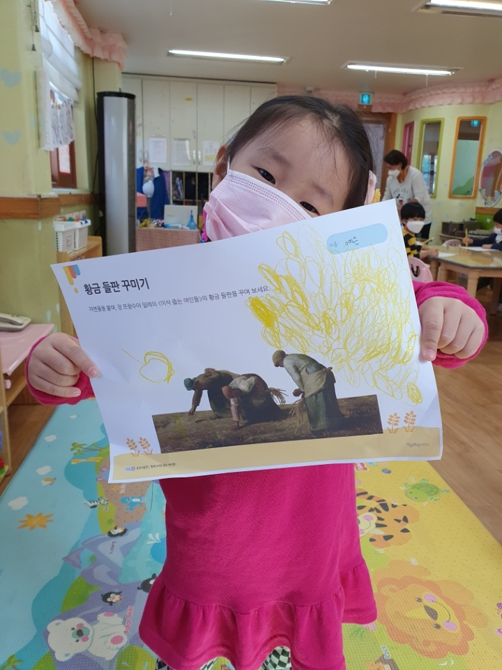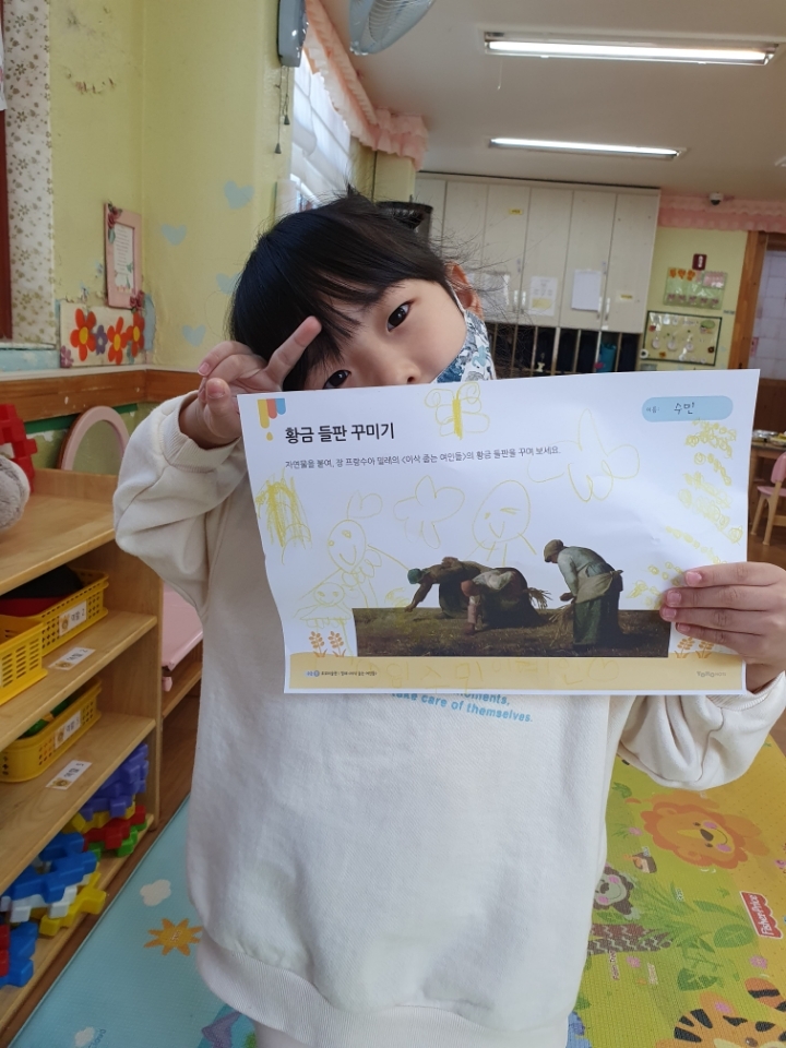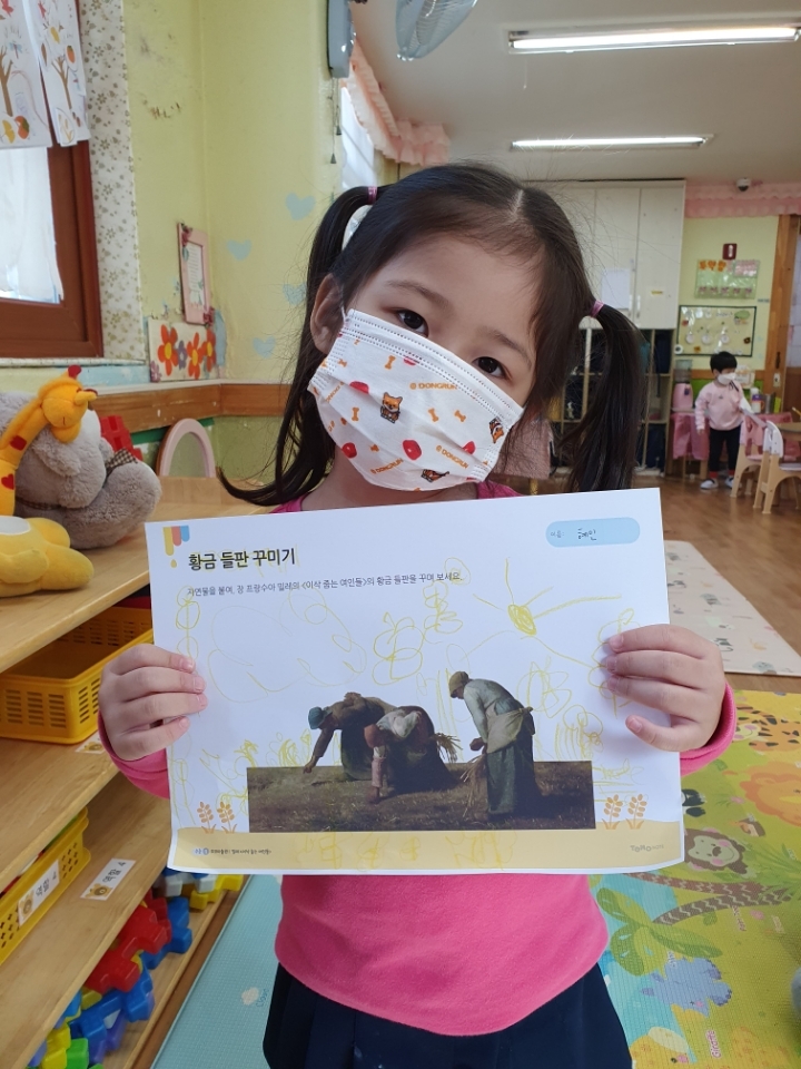 명화 - 장 프라수아 밀레 <이삭 줍는 여인들> 작성자연두반 교사|작성시간20.10.06|조회수1,015 목록 댓글 0 글자크기 작게가 글자크기 크게가 오늘은 이삭줍기에 대해 이야기 나누고 장 프랑수아 밀레의 <이삭 줍는 여인들> 작품을 감상해보았습니다.노랗게 익은 벼를 그려 명화를 창의적으로 재구성해 보기도 하였습니다🌾 다음검색 현재 게시글 추가 기능 열기 북마크 공유하기 신고 센터로 신고 댓글 댓글 0 댓글쓰기 답글쓰기 댓글 리스트