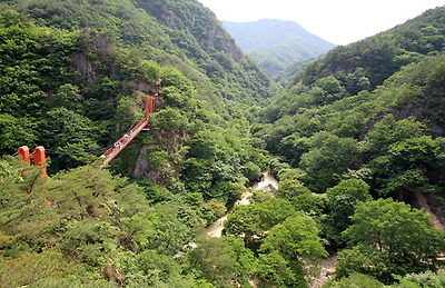 정상까지는 왕복 5시간. 비교적 길이 험하지 않아 어렵지 않게 오를 수 있지만, 산행이 부담스럽다면 매표소에서 구장군폭포까지 황토로 다져진 산책로를 추천한다. 맨발로 걸어도 좋을 만큼 부드러운 촉감의 흙길이 2.5km나 이어져 아이들과 함께 걷기에도 무리가 없다.
