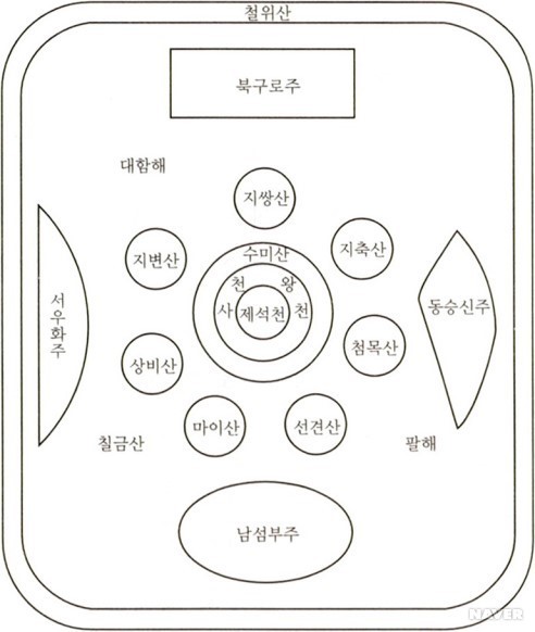 그러면 우리들이 살고 있는 이 세상은 어디에 있을까. 수미산이 세계의 중심이므로 수미산 주변이 되는데, 먼저 수미산 주변에 관해 알아보자. 수미산은 8개의 산으로 둘러싸여 있으며, 이들 산과 산 사이에는 큰 바다가 하나씩 있어서, 수미산을 포함해 산이 9개, 바다는 8개가 된다. 이를 구산팔해(九山八海)라 부른다. 이들 산과 바다의 맨 바깥쪽, 즉 아홉 번째 산이 철위산(鐵圍山)인데 이 산 바깥에는 동서남북 각 방향으로 4개의 대륙이 존재한다. 이 4개의 대륙은 동승신주·서우화주·남섬부주·북구로주인데 이 중에서 우리가 살고 있는 곳은 남섬부주라고 한다.