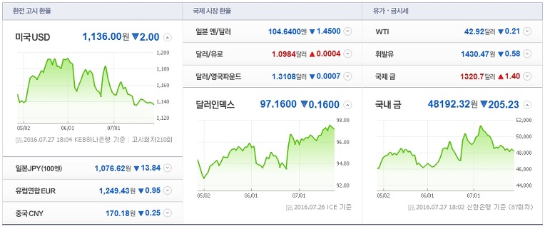 2016년 7월 27일 오늘 시장지표 & 원달러환율 그래프 18시 02분