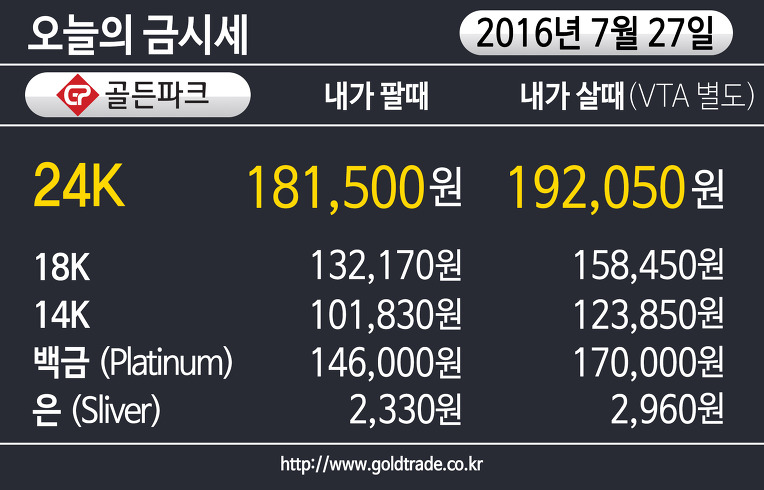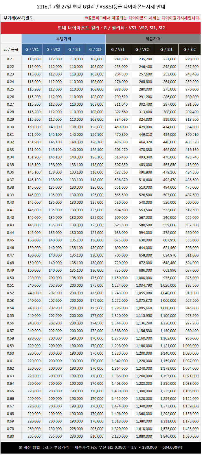 2016년 7월 27일 수요일 금가격, 다이아몬드 시세표 안내