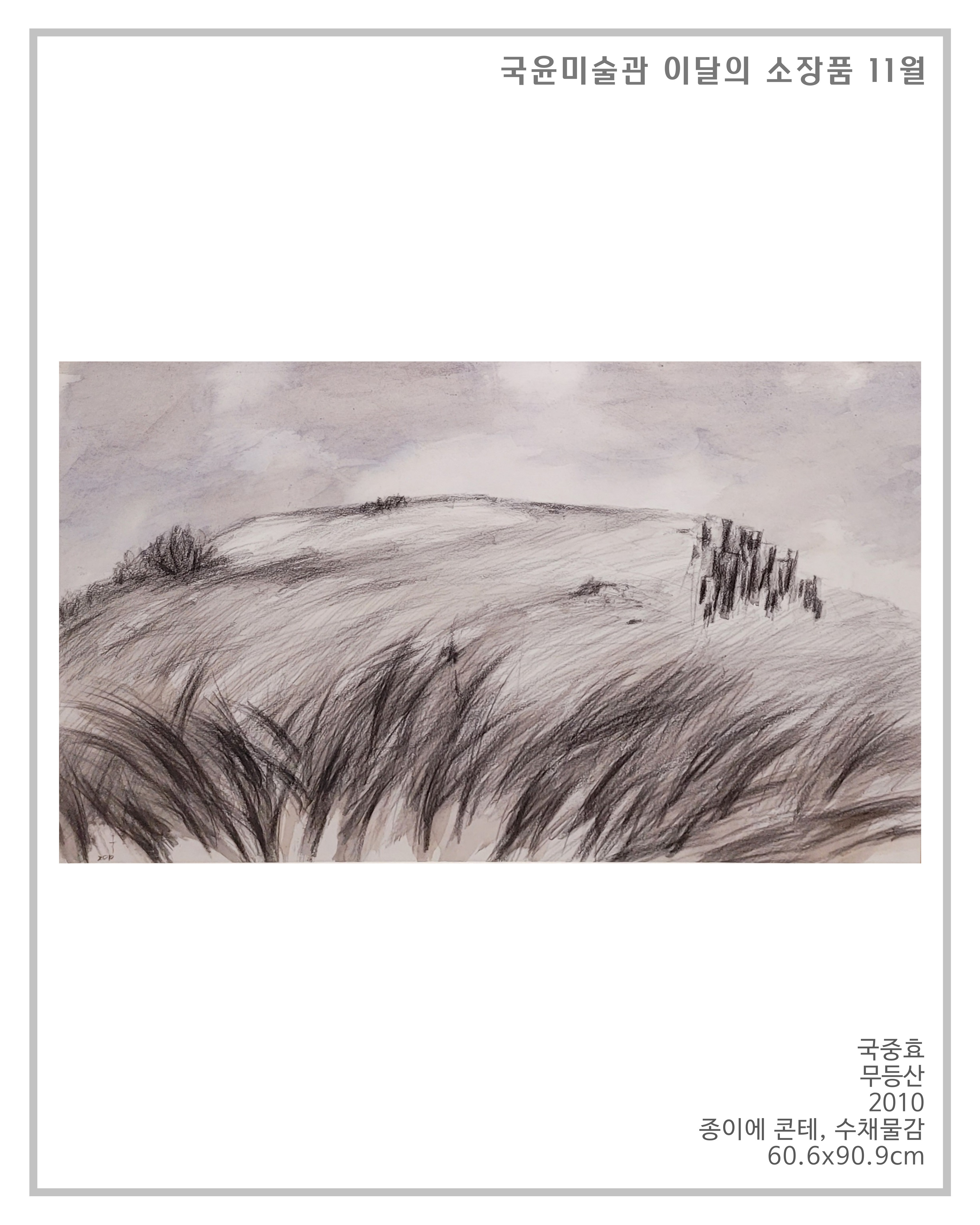 2025년 11월_이달의 소장품 작성자서기|작성시간25.11.05|조회수9 목록 댓글 0 글자크기 작게가 글자크기 크게가 🎨국윤미술관 이달의 소장품- 11월!🎨 국중효 作, <무등산>, 2010, 종이에 콘테, 수채물감, 60.6x90.9cm 문의 - 062-232-7335 다음검색 현재 게시글 추가 기능 열기 북마크 공유하기 신고 센터로 신고 댓글 댓글 0 댓글쓰기 답글쓰기 댓글 리스트