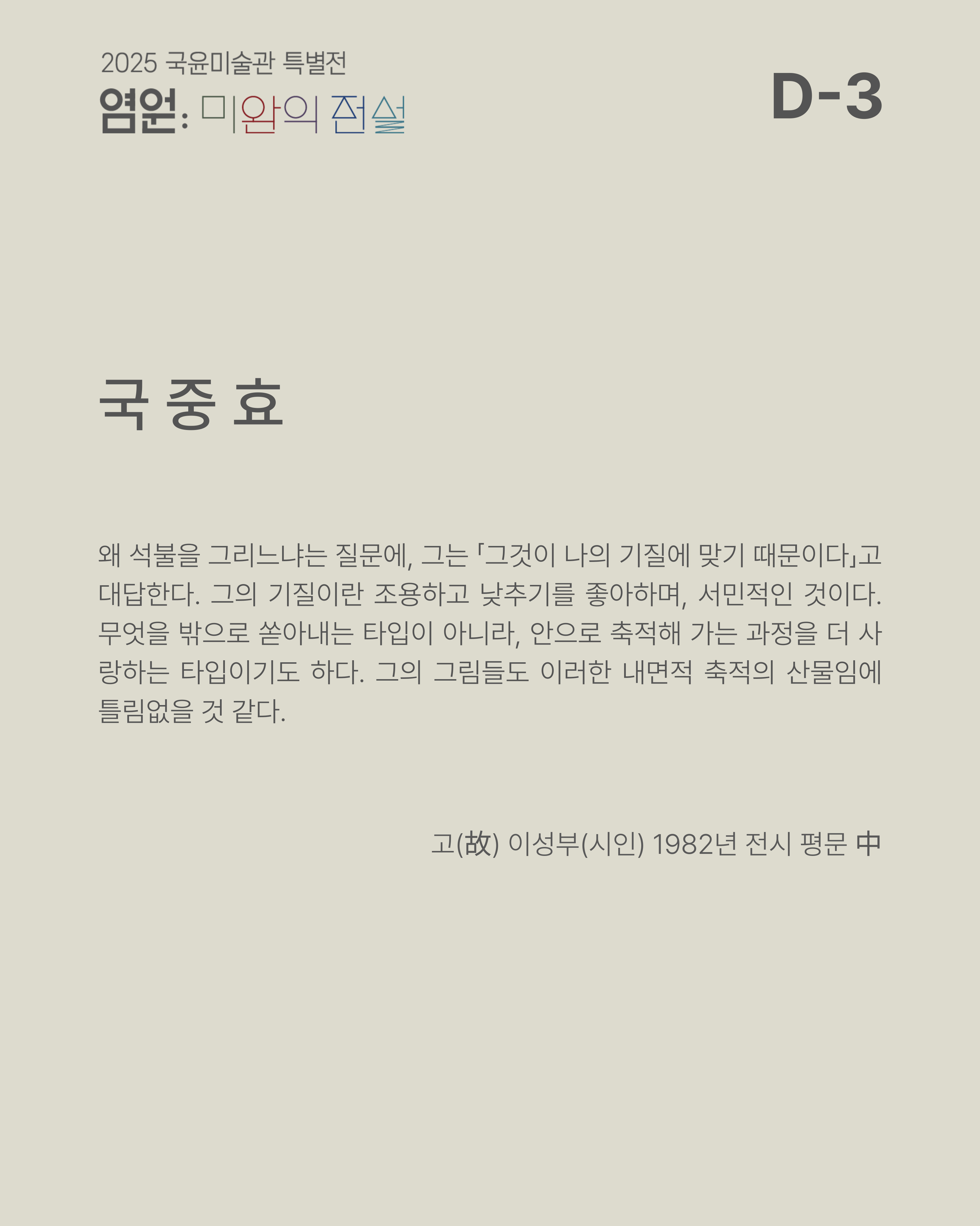 <염원: 미완의 전설> 국중효 작가님의 대표작과 평론 일부를 만나볼 수 있답니다.