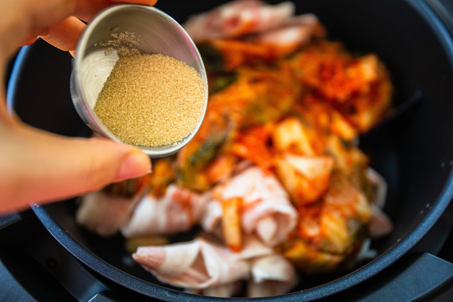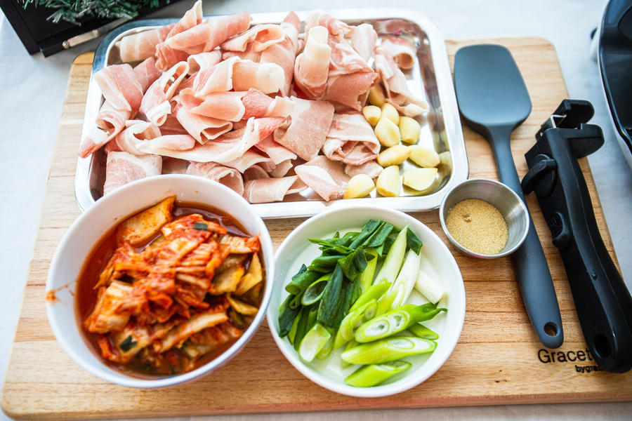 대패삼겹살, 신김치, 설탕, 대파