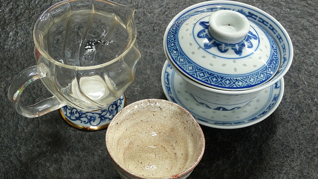 다기는 청화백자 개완과 유리숙우 그리고 분청잔을 사용하였다