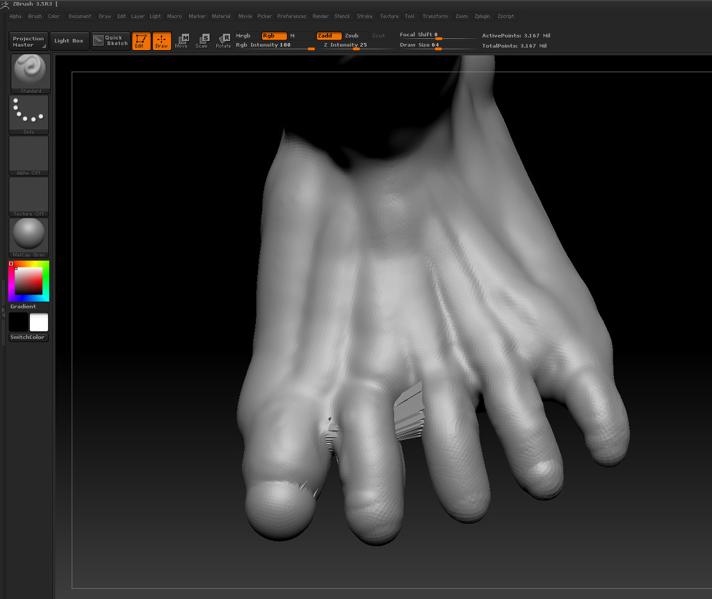 작성자동그란곰 작성시간 10.02.27 80%정도 성공했던 팁이 있습니다만 도움이 될른지...하위 지오메트리부터 한 단계씩 프로젝트올 하면서 올라가면 덜 깨어집니다. 글고 주로 깨어지는 면은 손가락,발가락등 이웃한 면으로 버텍스들이 튀거든요..그래서 주로 튀는부분은 하이드 시켜놓고 남은 부분의 프로젝트 작업 완료해놓고 하이드 뒤집어서 단계올려가면서 일일이 수정해주는 방법이 있습니다..무식하지만ㅠ_ㅠ 예를들면..검지 바깥쪽이 중지 안쪽면 위로 버텍스가 붙는 경우는 (손가락 하나씩 폴리그룹을 지정해놓은 상태) 튀는 부분만 쉬프트+클릭해서 수정해주고 전체보이기로 돌아가고..아님 백페이스마스크를 이용하여 튀는곳만 마스킹해서 작업하시면 웬만큼은 됩니다.