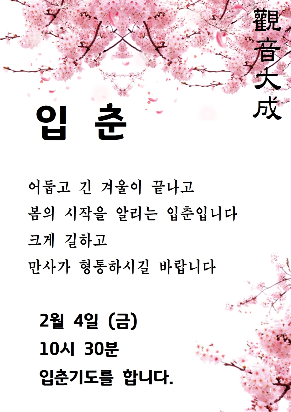 [(알림)]불기 2566년 임인년 입춘 작성자법 효|작성시간22.01.06|조회수71 목록 댓글 0 글자크기 작게가 글자크기 크게가 다음검색 현재 게시글 추가 기능 열기 북마크 공유하기 신고 센터로 신고 댓글 댓글 0 댓글쓰기 답글쓰기 댓글 리스트